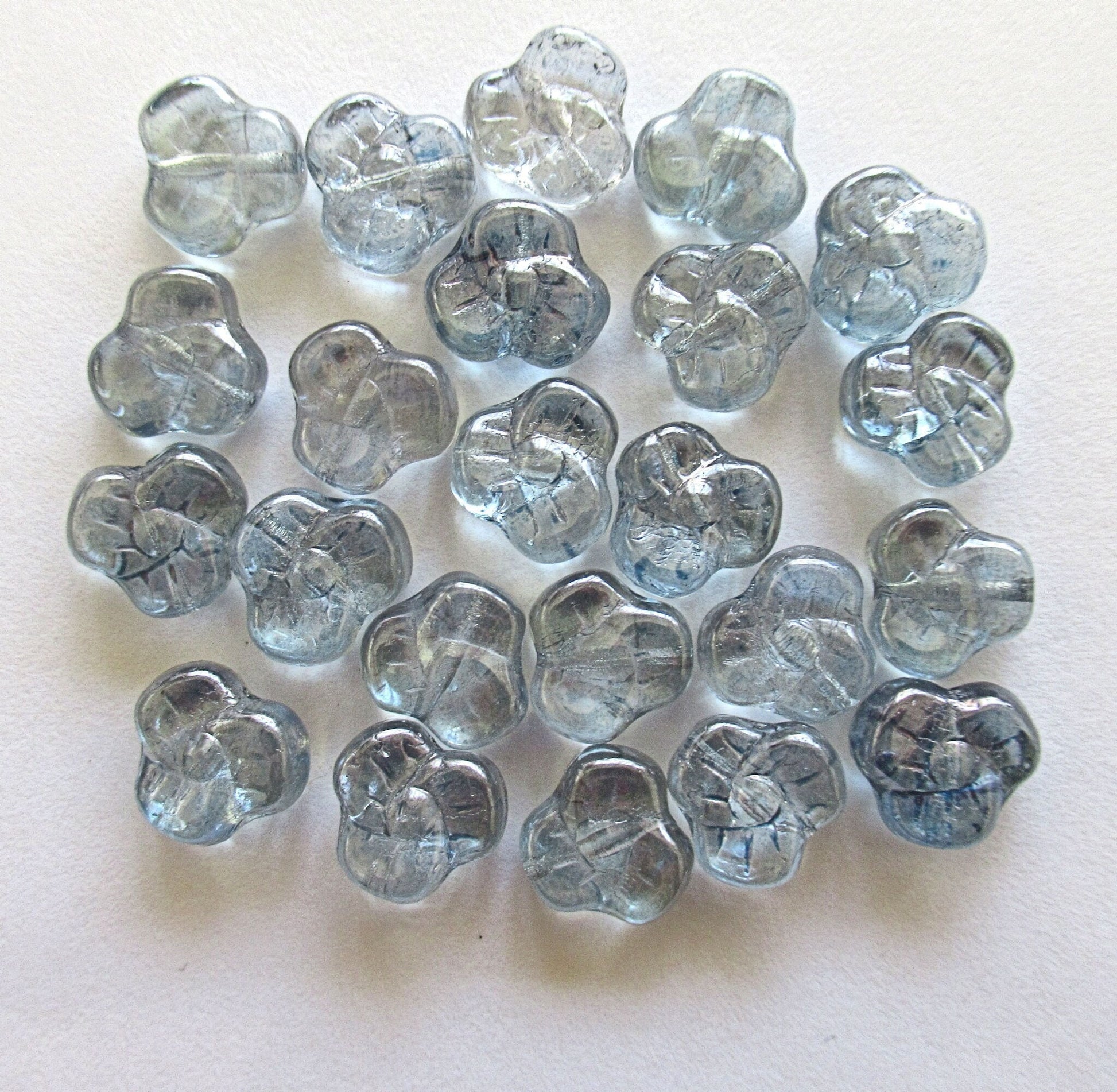Lot of 25 9mm Czech glass pansy beads - flat transparent lumi blue flower beads C00411