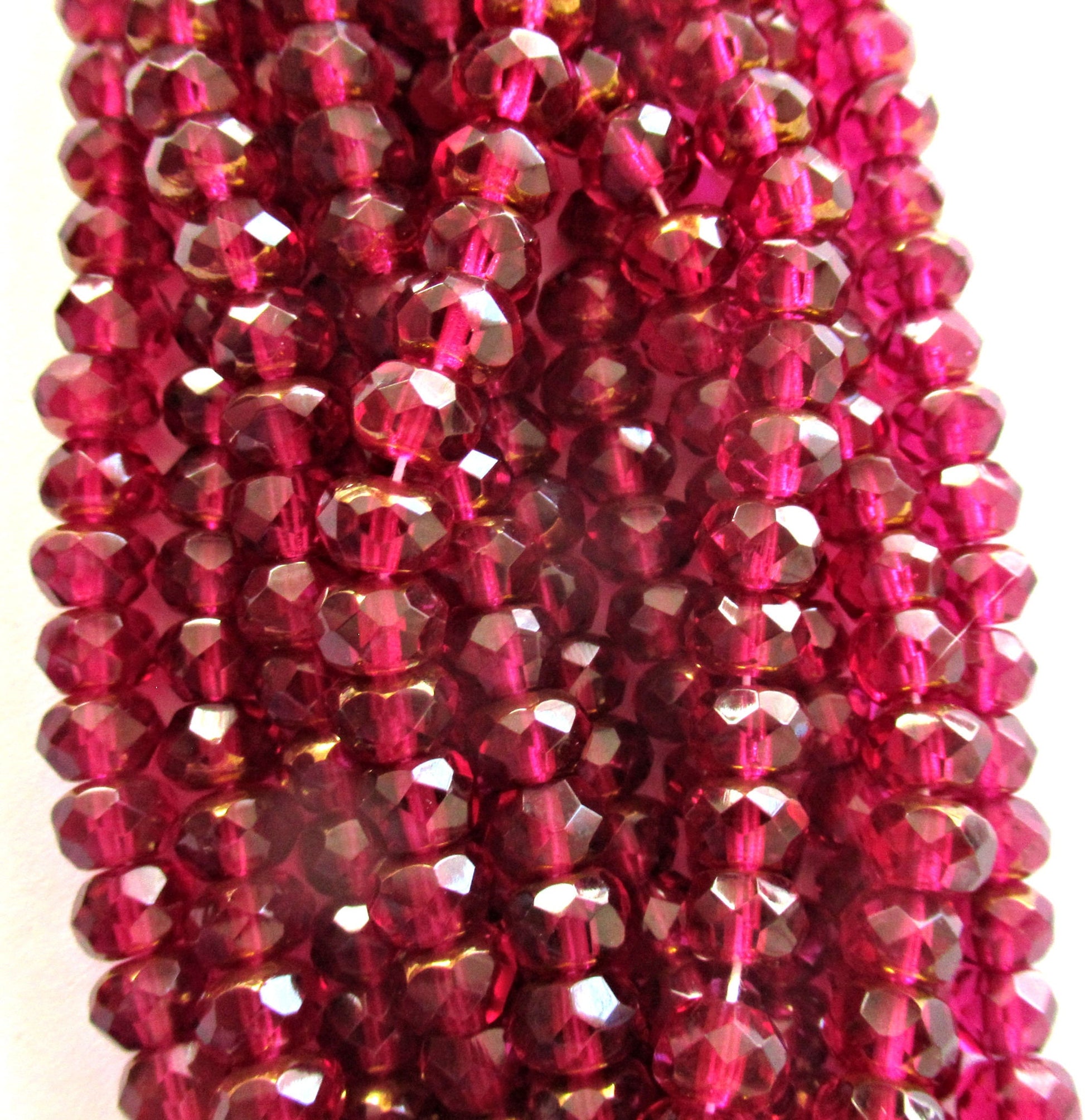 Lot of 25 Czech glass faceted puffy rondelle beads - 5 x 7mm fuchsia or deep pink with copper accents rondelles - C00411