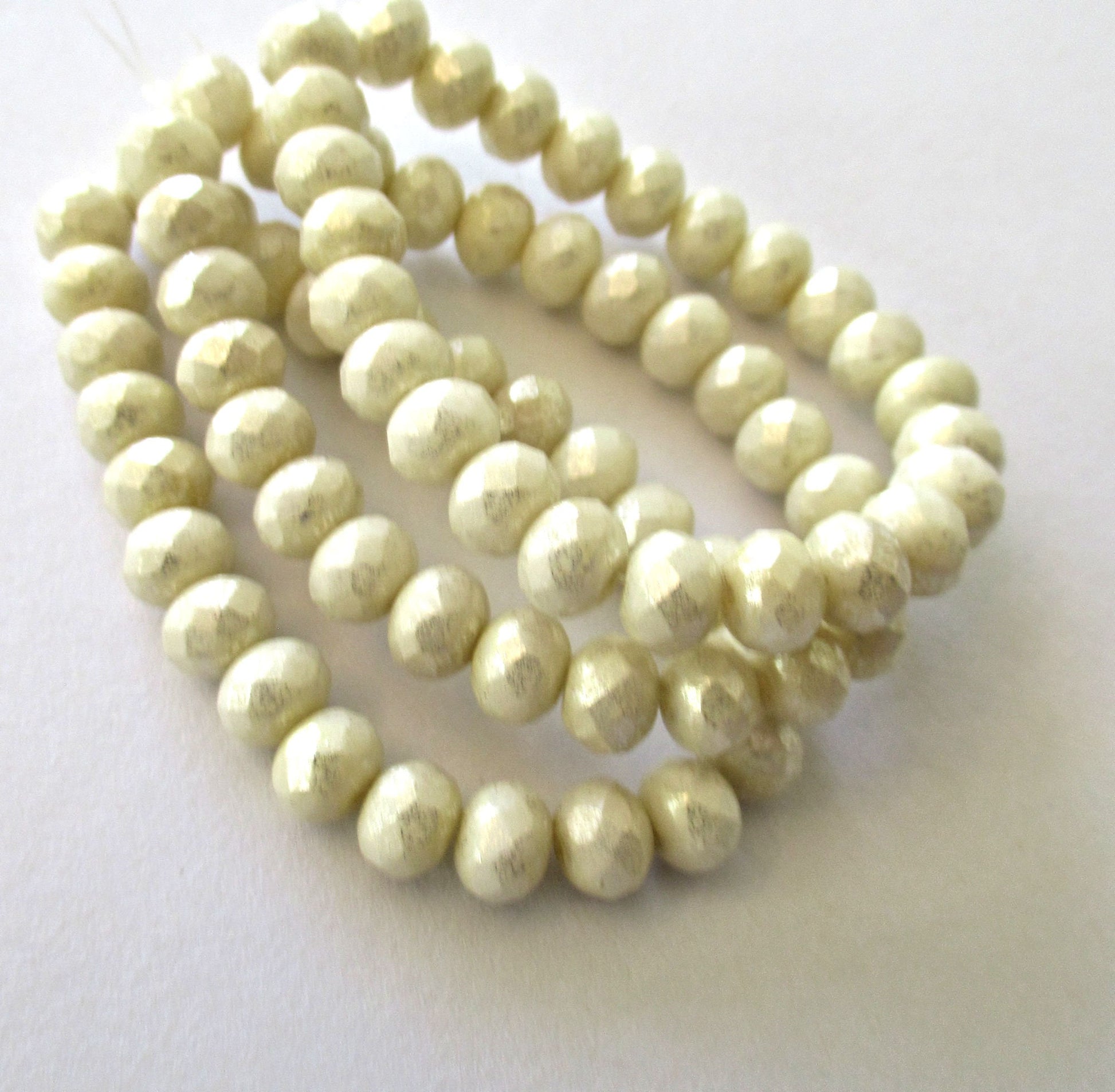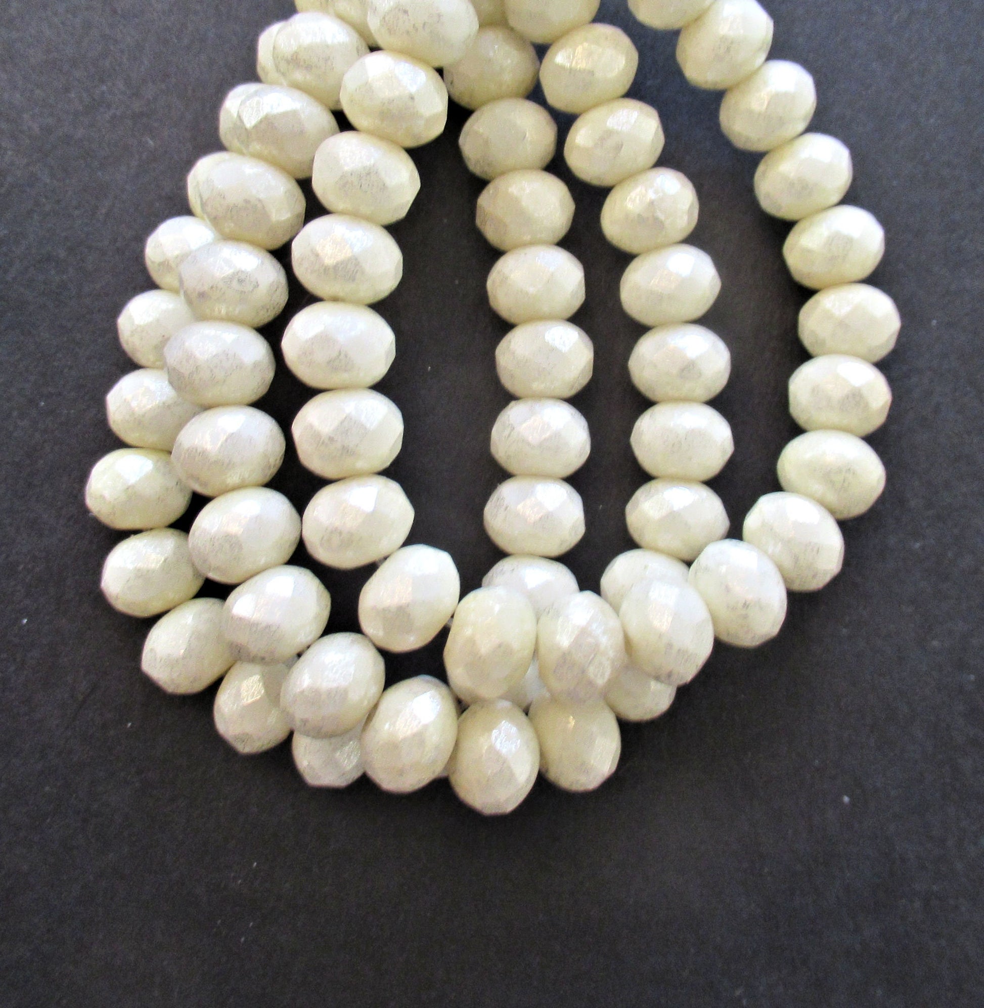 Lot of 25 Czech glass faceted puffy rondelle beads - 5 x 7mm opaque off white / ivory with a splotchy mercury finish - rondelles C00014