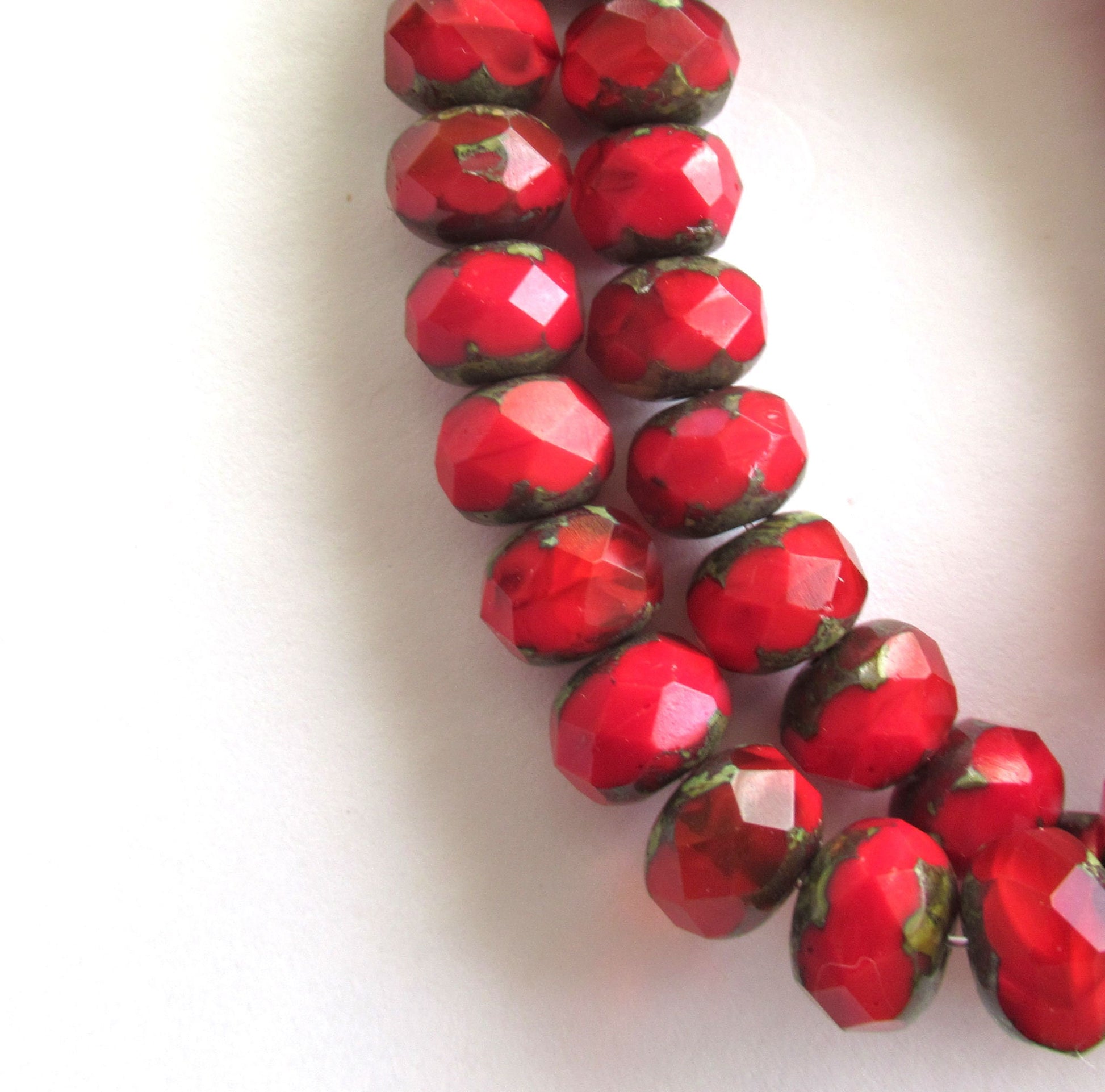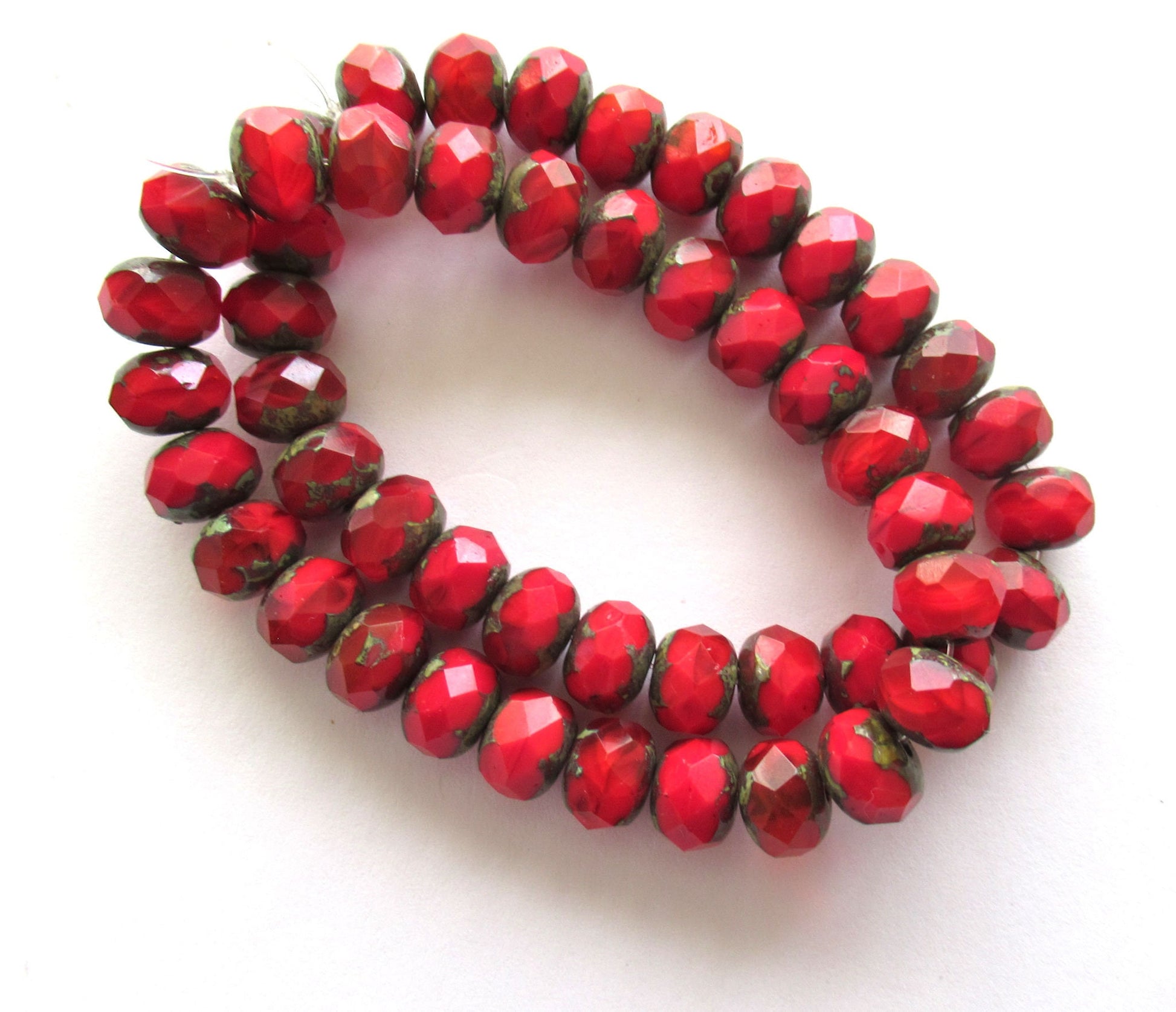 Lot of 25 Czech glass faceted puffy rondelle beads - 6 x 9mm opaque bright red silk picasso rondelles C00523