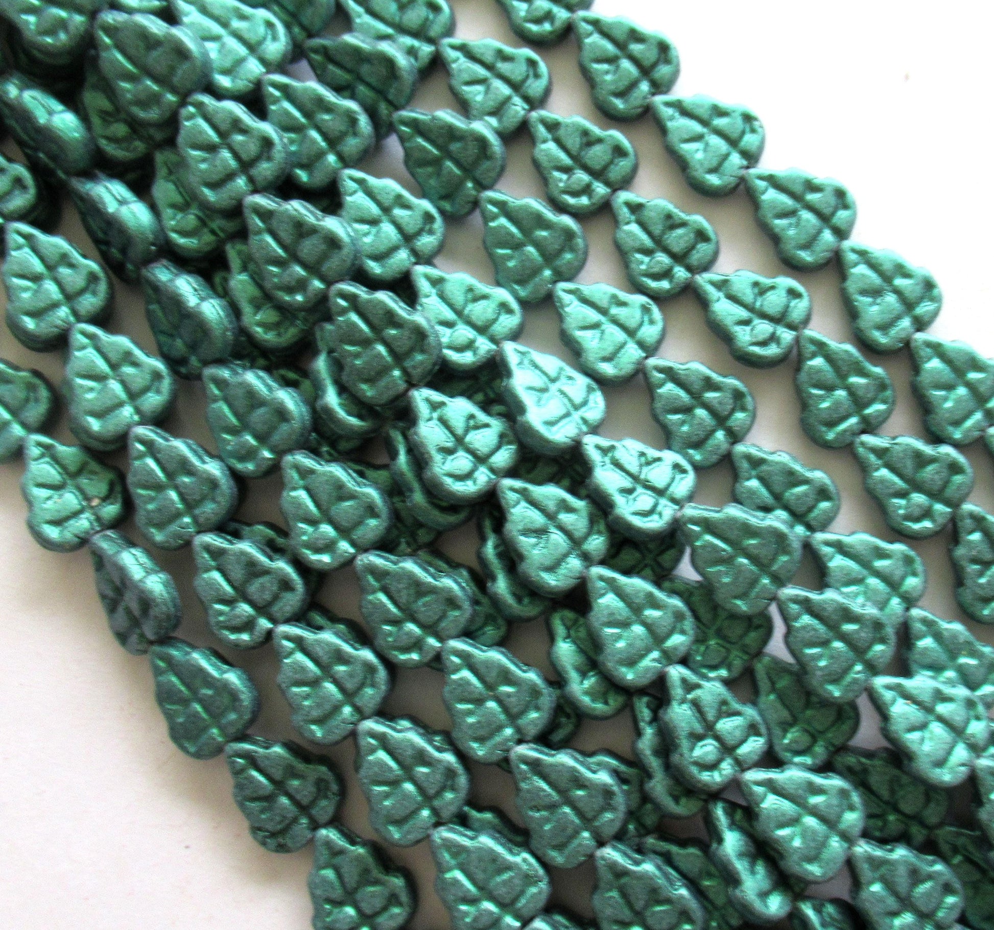 25 Czech glass leaf beads - matte metallic suede leafy green beads - 8 x 10mm leaves - C0076