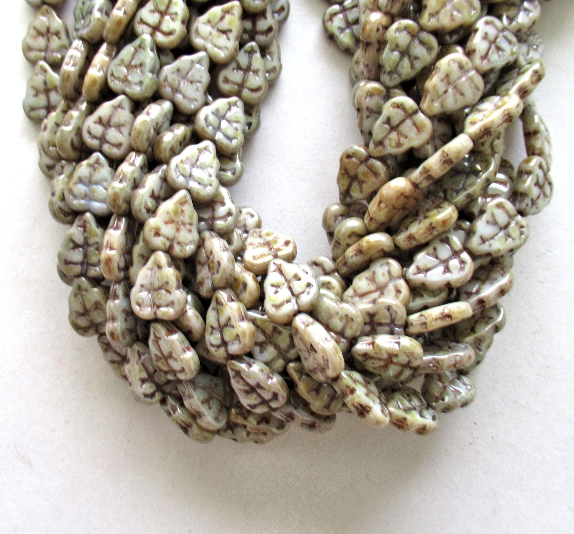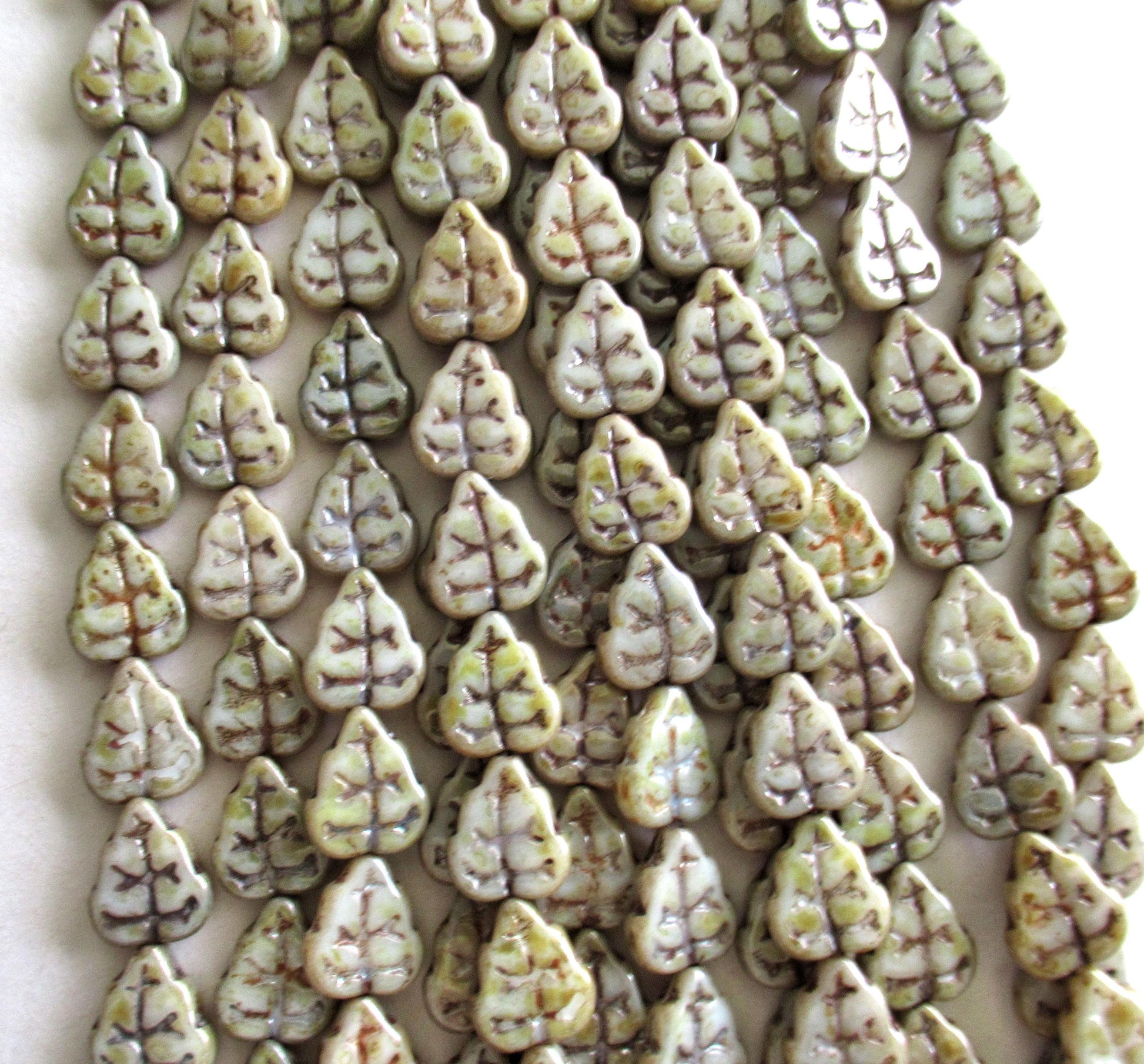 25 Czech glass leaf beads - opaque luster green picasso - 8 x 10mm leaves - C0006