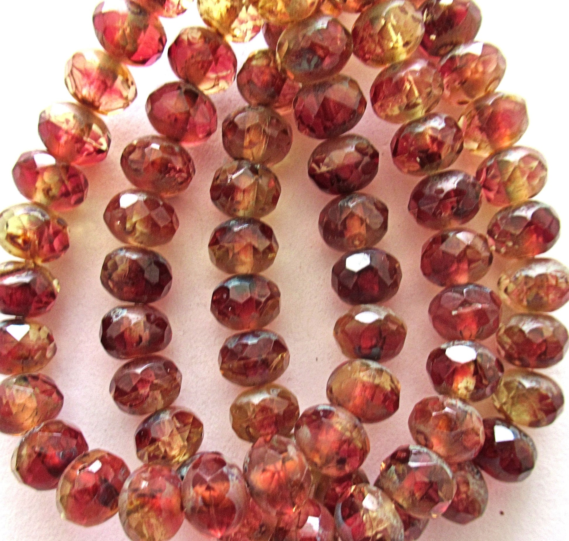 Lot of 25 Czech glass puffy rondelle beads - 5 x 7mm amber & pink color mix faceted rondelles C00961