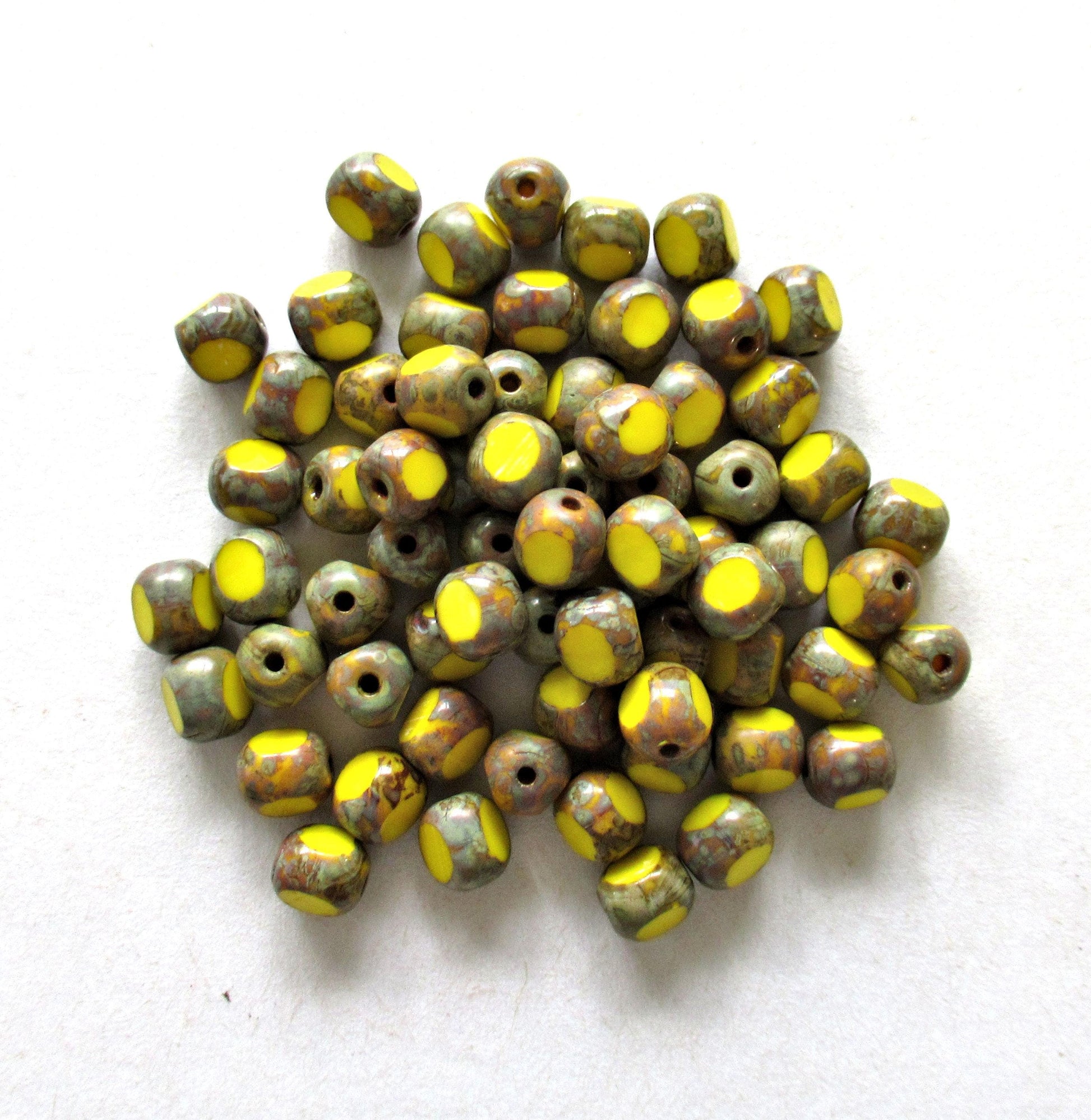 Lot of 25 Czech glass Tri-cut - Round beads - 6mm - opaque yellow picasso - faceted table cut rustic earthy window beads C0057