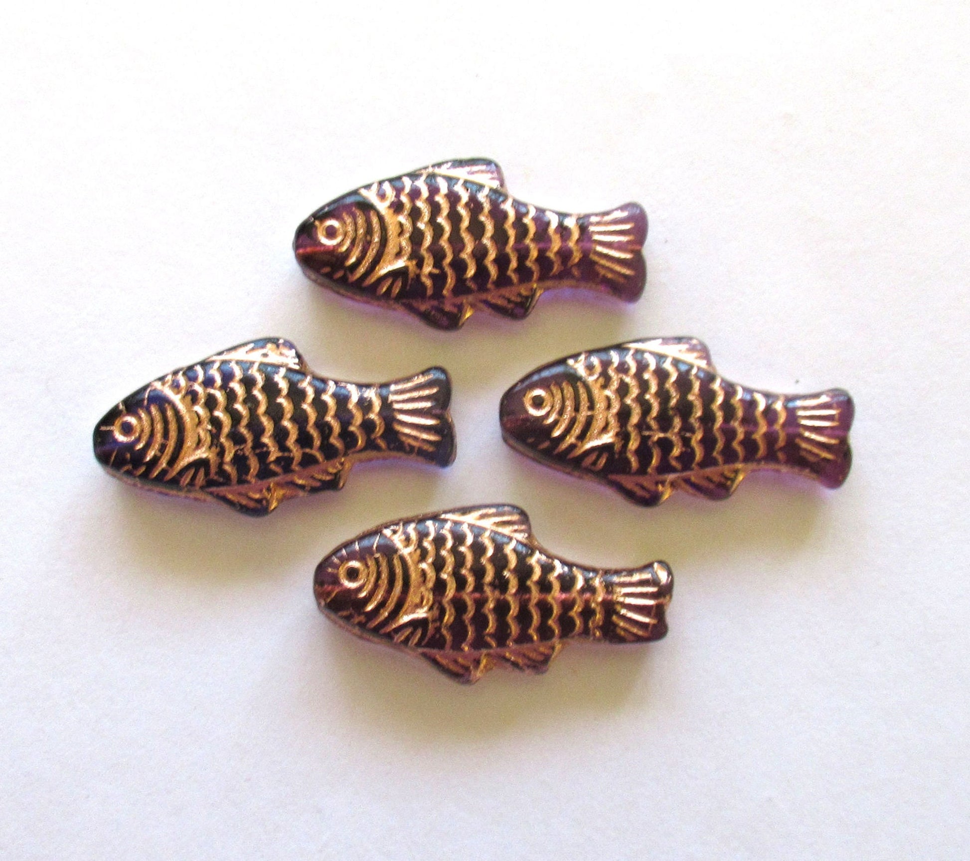 lot of 4 large Czech glass fish beads - 25 x 14mm transparent light amethyst / purple fish with a gold wash - C0057