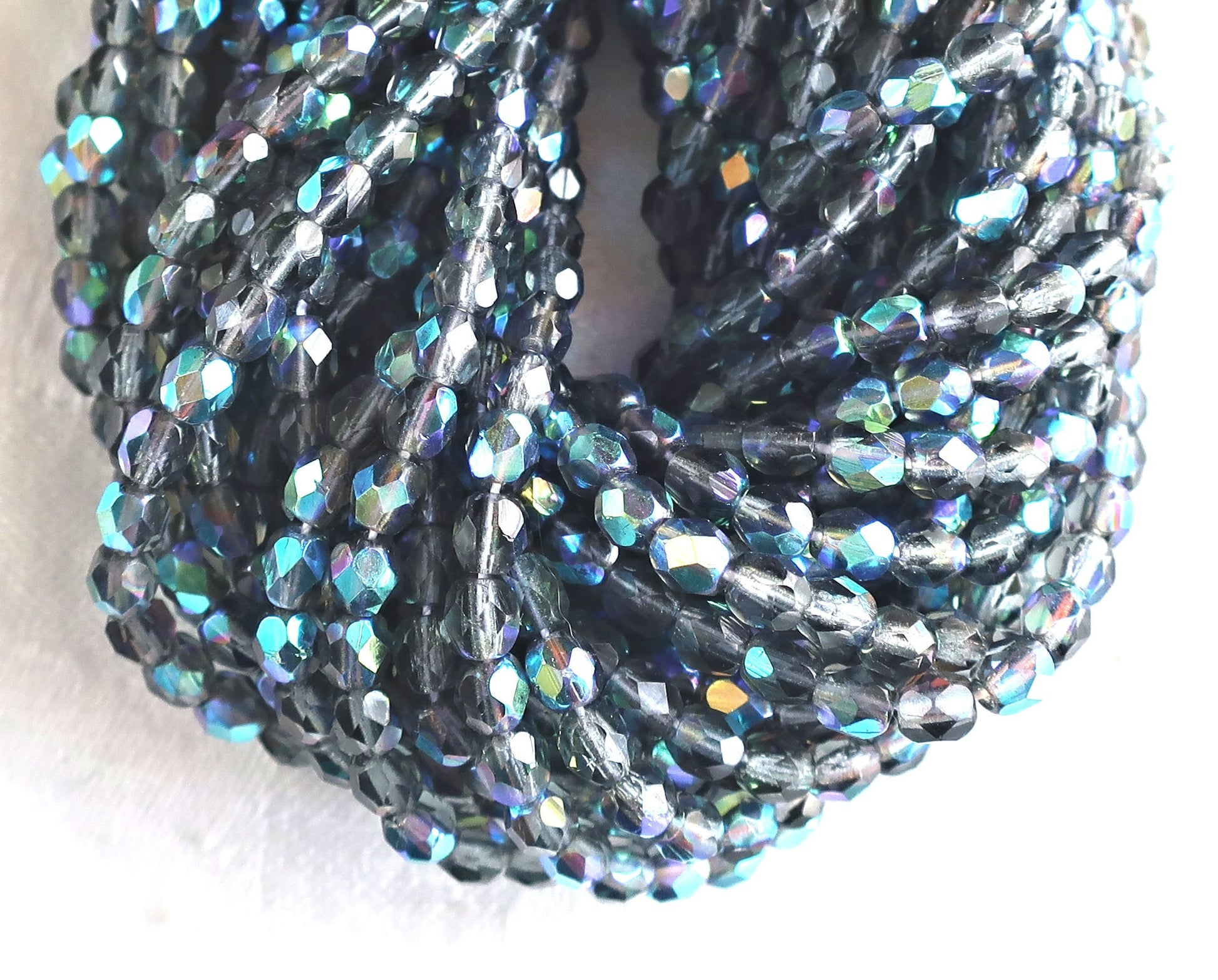 Lot of 50 4mm Montana Blue AB Czech glass beads, fire polished faceted round beads.