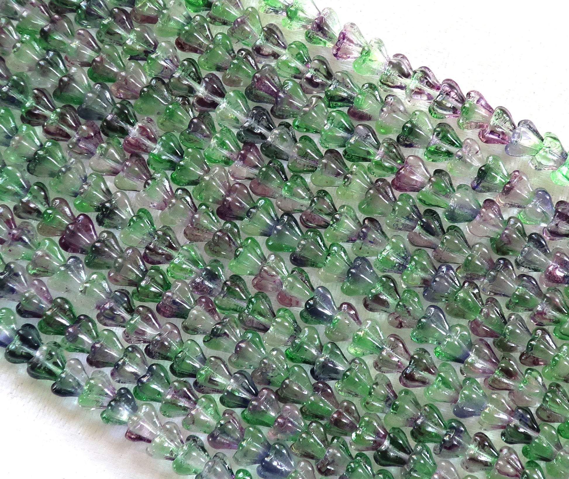 Lot of 50 6mm x 4mm Blueberry Green Tea baby Bell Flower Czech glass beads, blue/violet & green pressed glass beads C0089