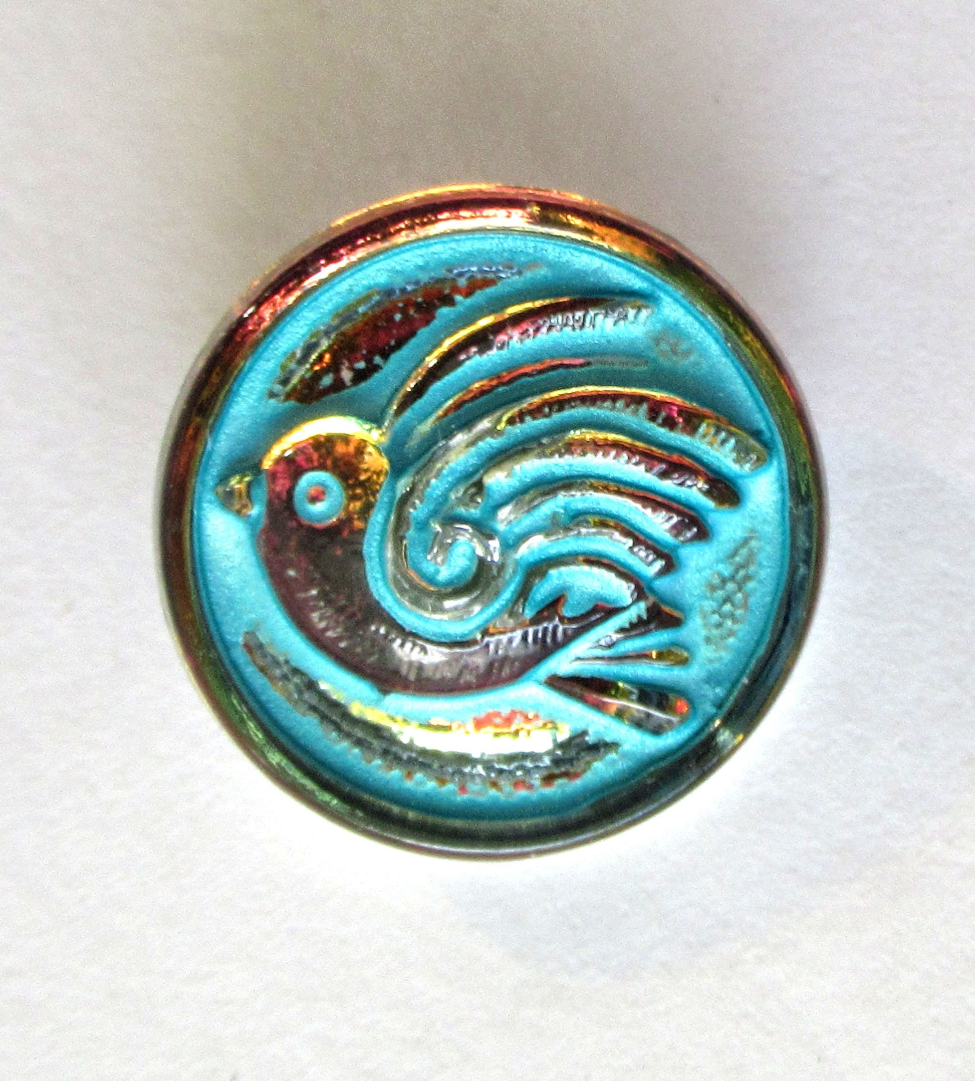 One 18mm Czech glass bird button - iridescent pink orange & yellow with a turquoise wash - decorative shank buttons 000432