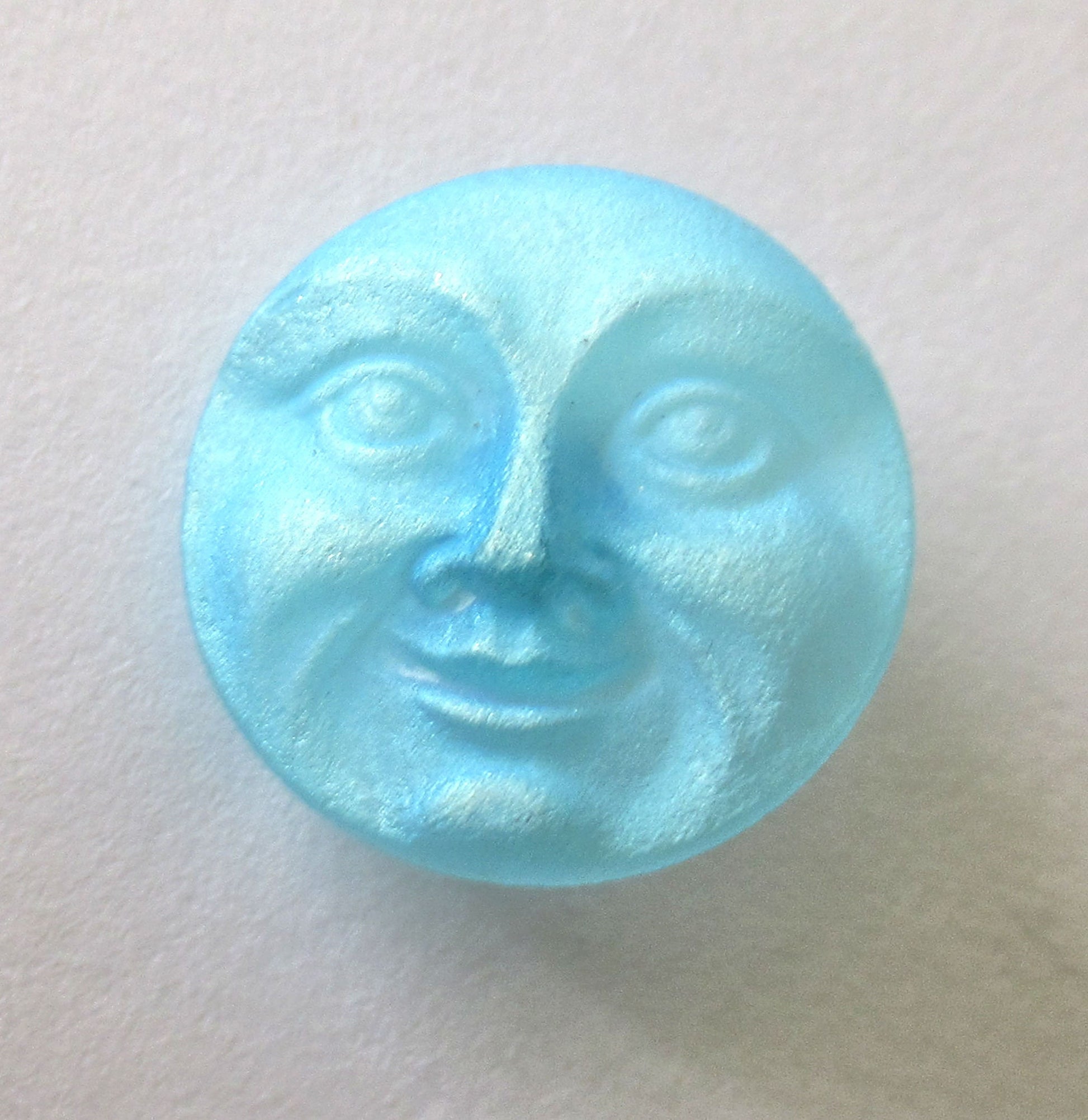 It is a small matte teal blue green ab moon face decorative shank button.