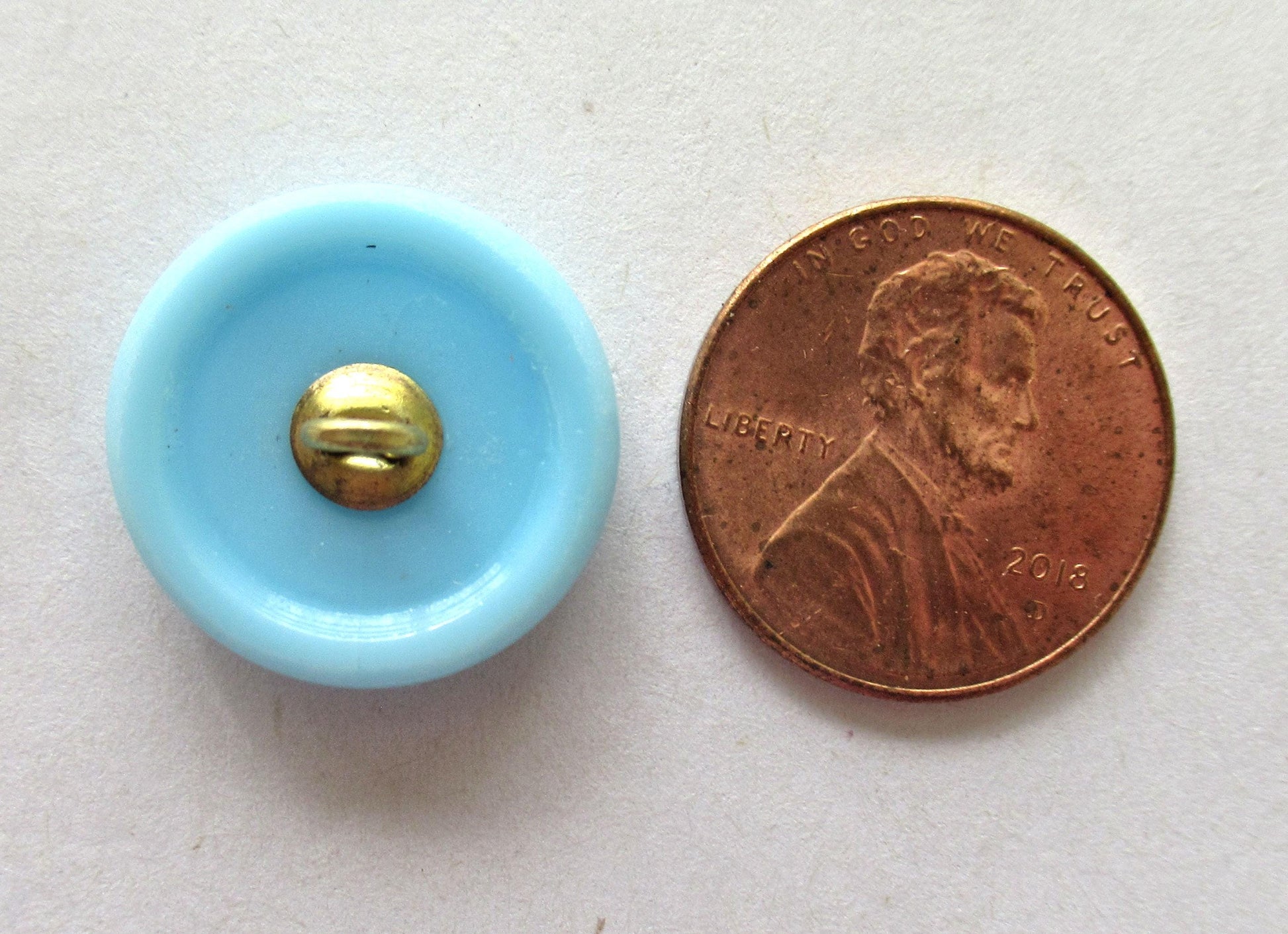 This is an opaque sky blue button with a raised cat face hand painted gold, black and pink.
