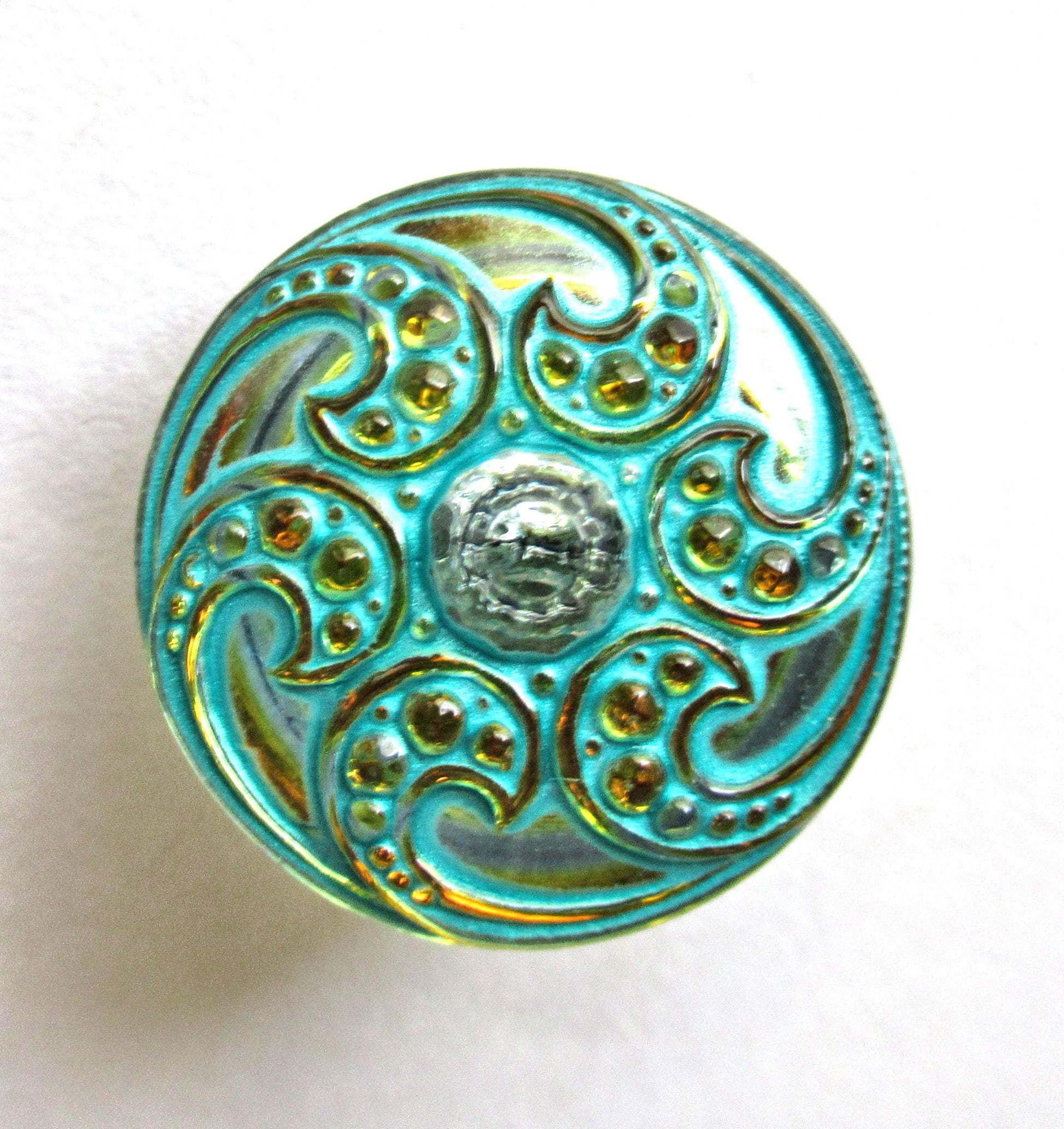 One 18mm Czech glass button - orange w/ rhinestone and a turquoise wash- fancy pattern decorative shank button 00052