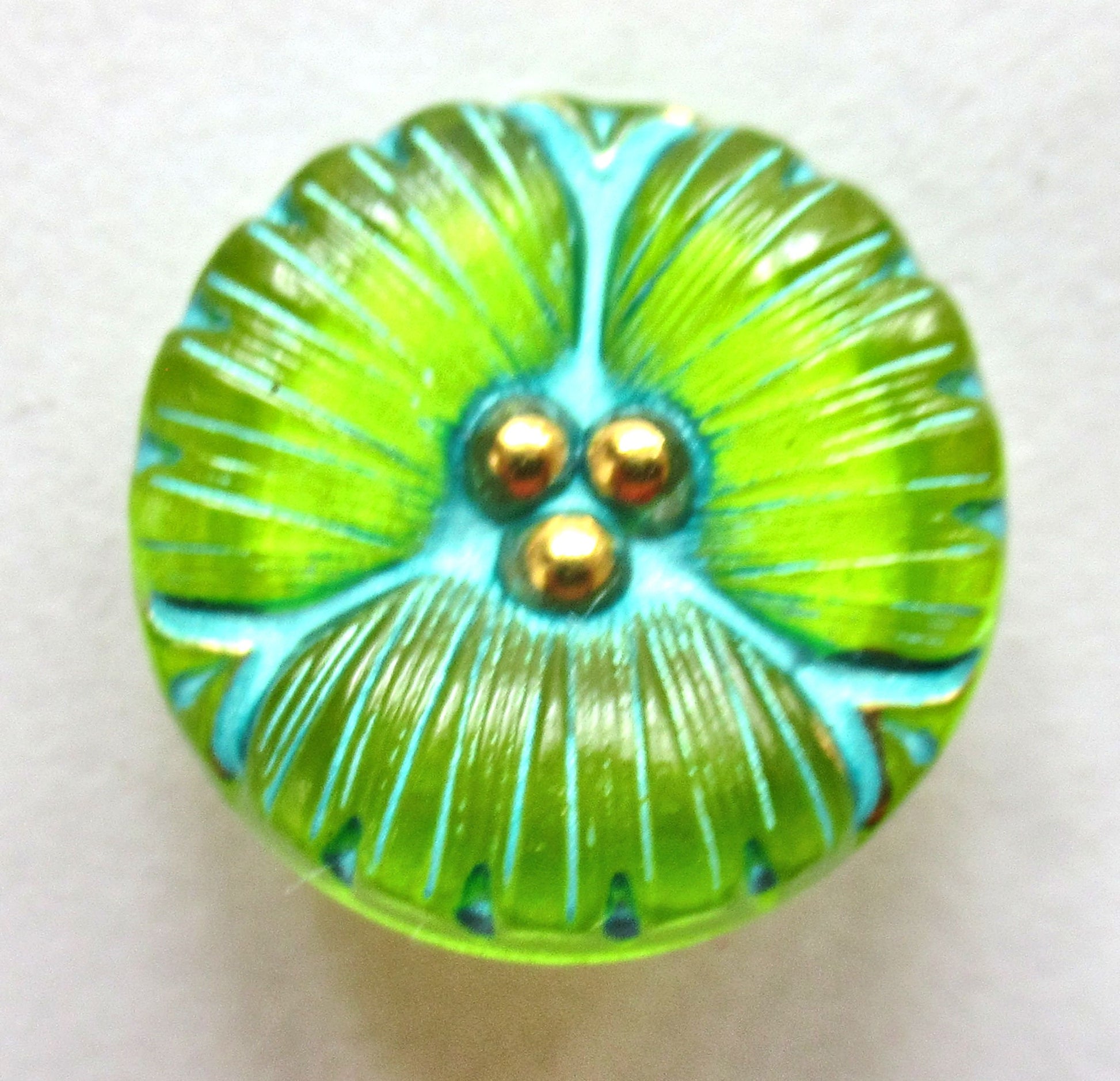 One 18mm Czech glass flower button - lime green flower with gold accents and a blue wash - decorative floral shank buttons 56101