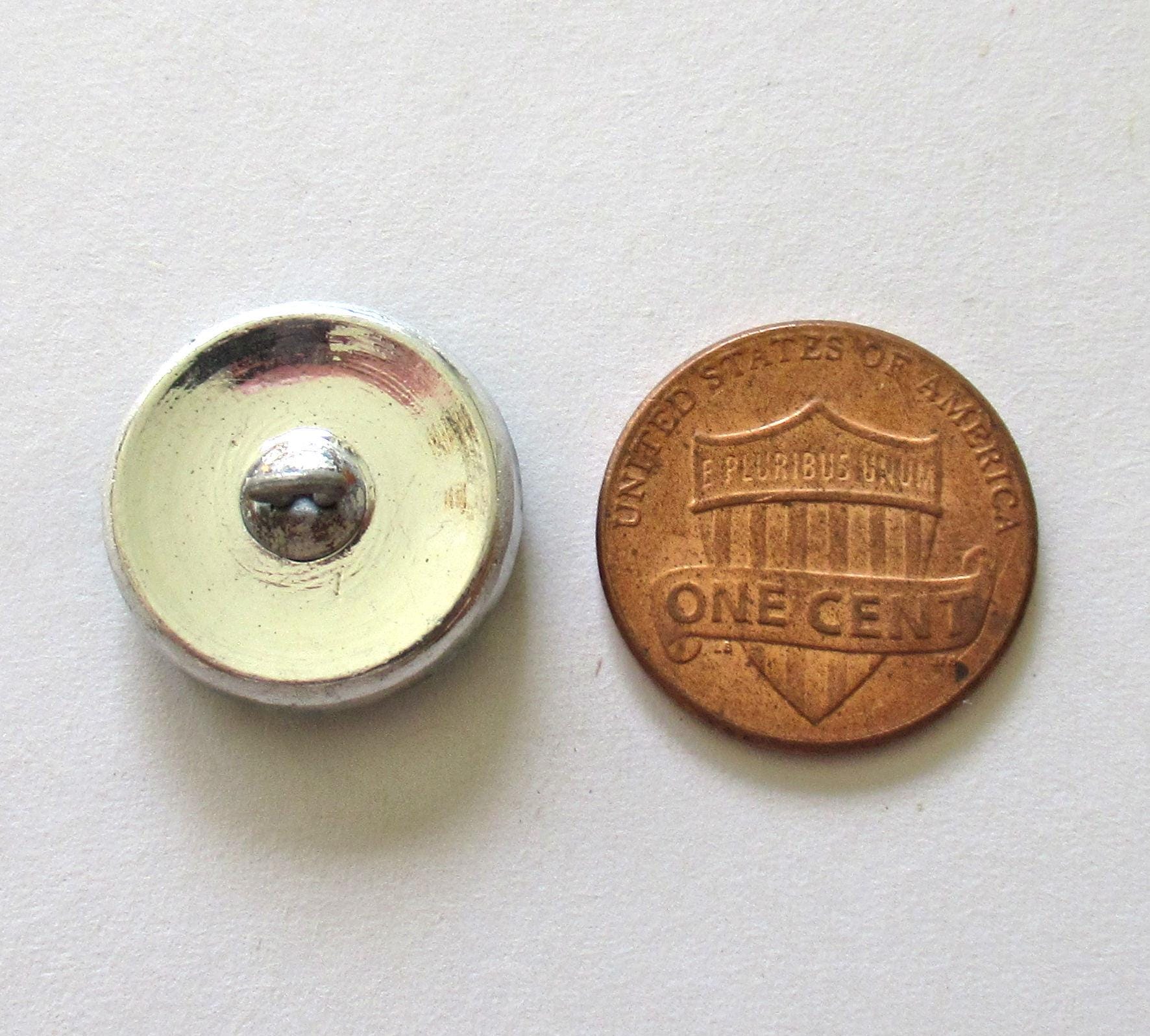 It is a pink & purple button with silver accents and a turquoise blue wash. You can see different colors in the button as you look at it from different angles.