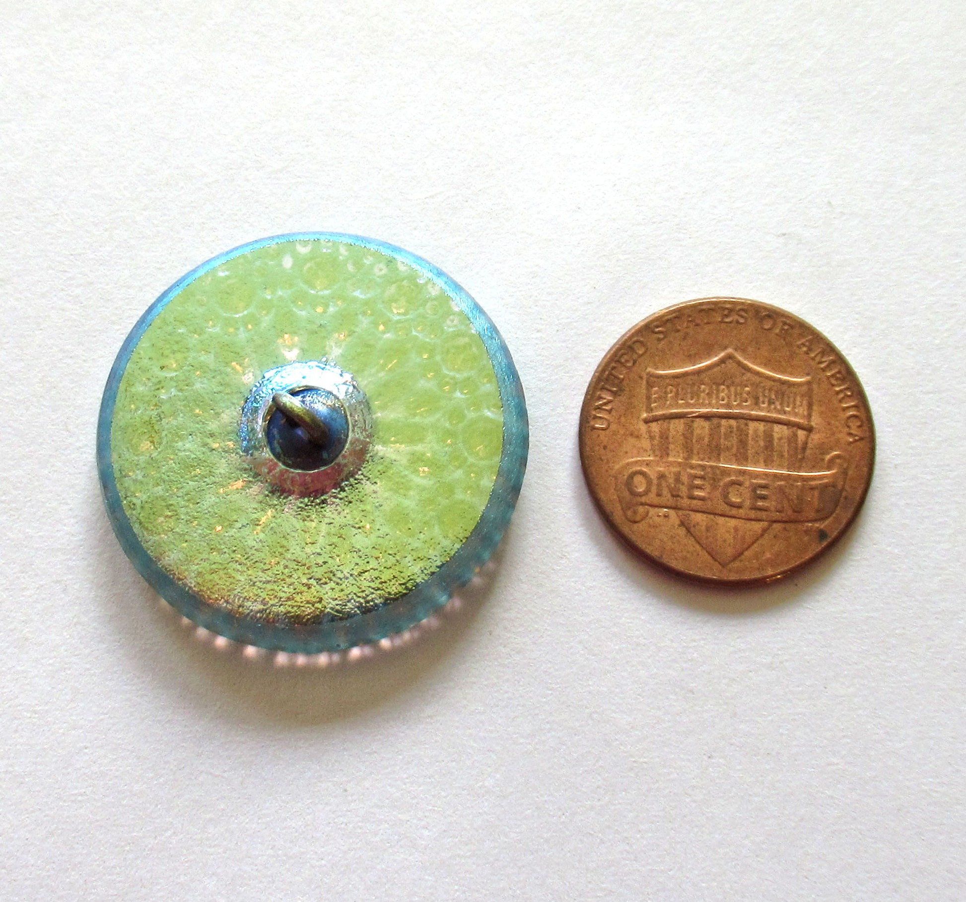 This is for one 22mm Czech glass button. It is decorated with a raised gold and milky white starburst in the center and a verdigris blue green wash. It is a decorative shank button that would would be great addition to a wrap bracelet, or any number of other projects.
