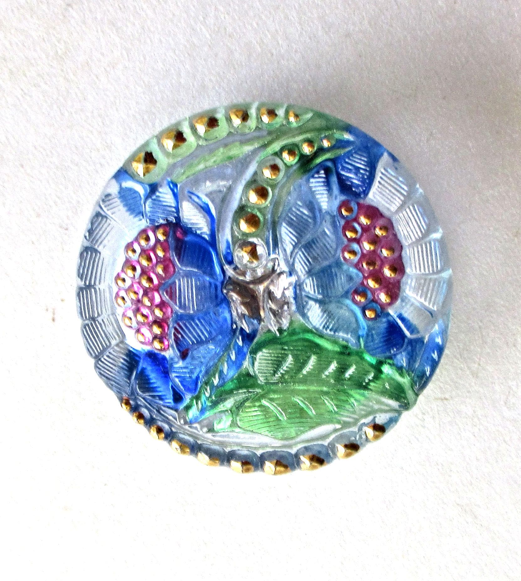 The button is made with blue, green, pink and clear glass with gold accents.