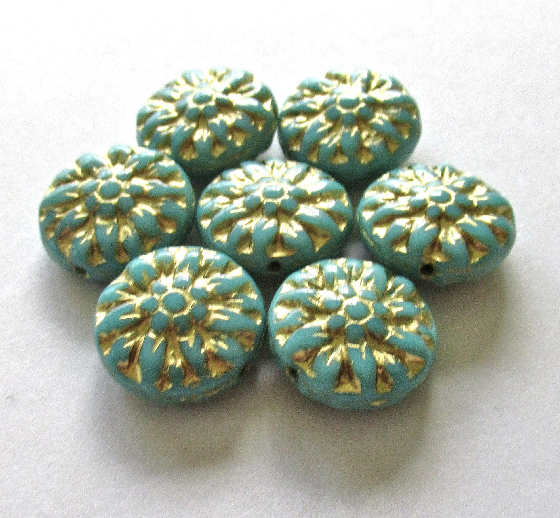 Six 14mm Czech glass Dahlia flower beads - light turquoise blue green w/ gold wash - floral puffy disc coin or pillow beads C00021