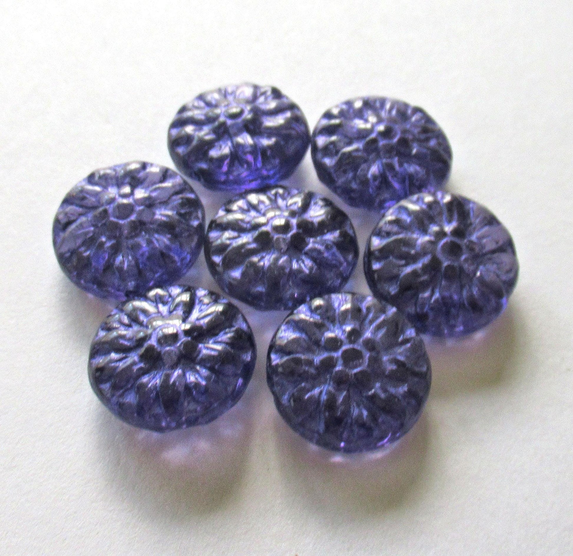 Six 14mm Czech glass Dahlia flower beads - transparent tanzanite purple beads w/ purple wash - puffy pillow coin or disc beads - C0009