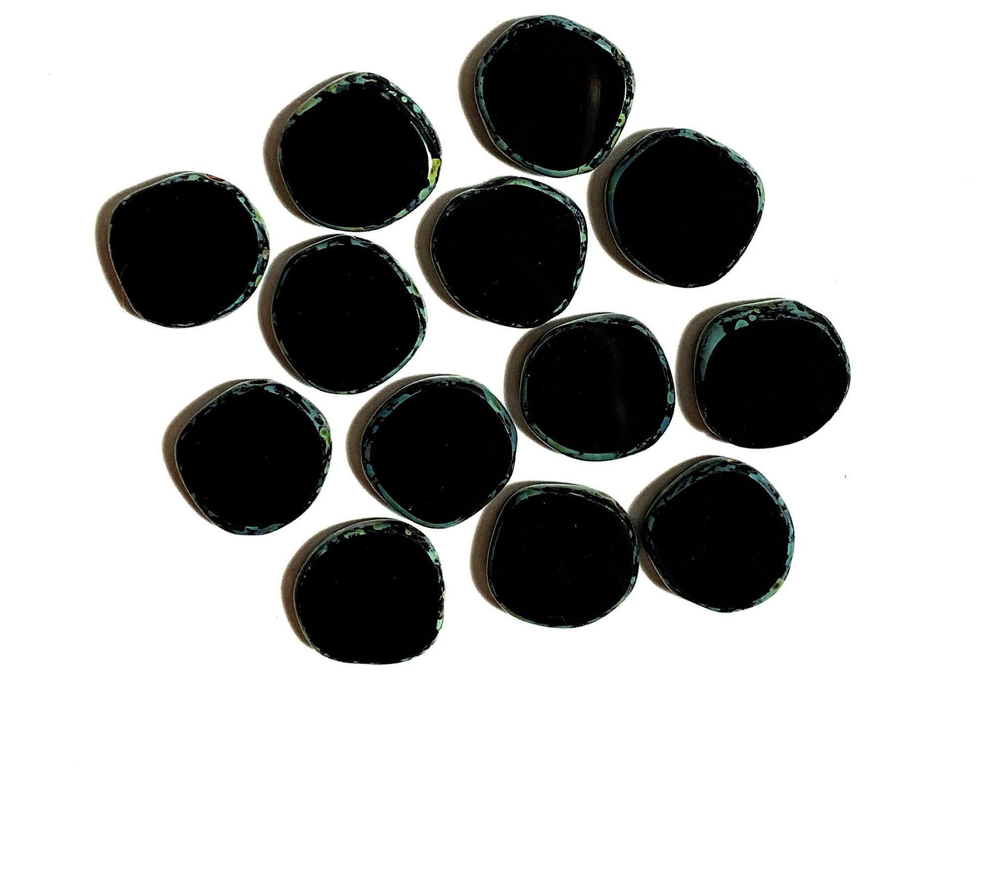 Six 15mm Czech glass asymmetrical coin or disc beads - jet black picasso table cut rustic earthy beads - C0601