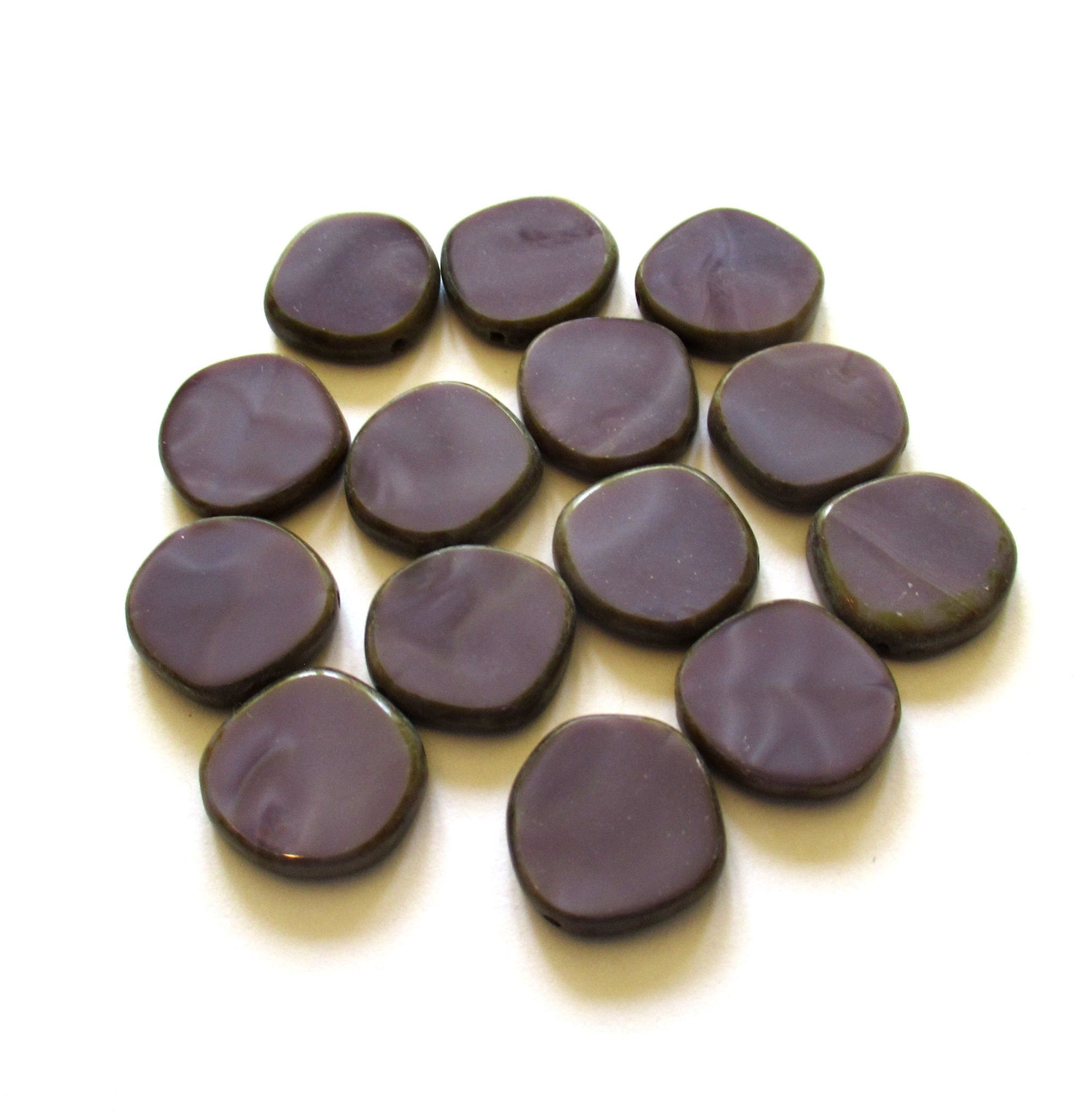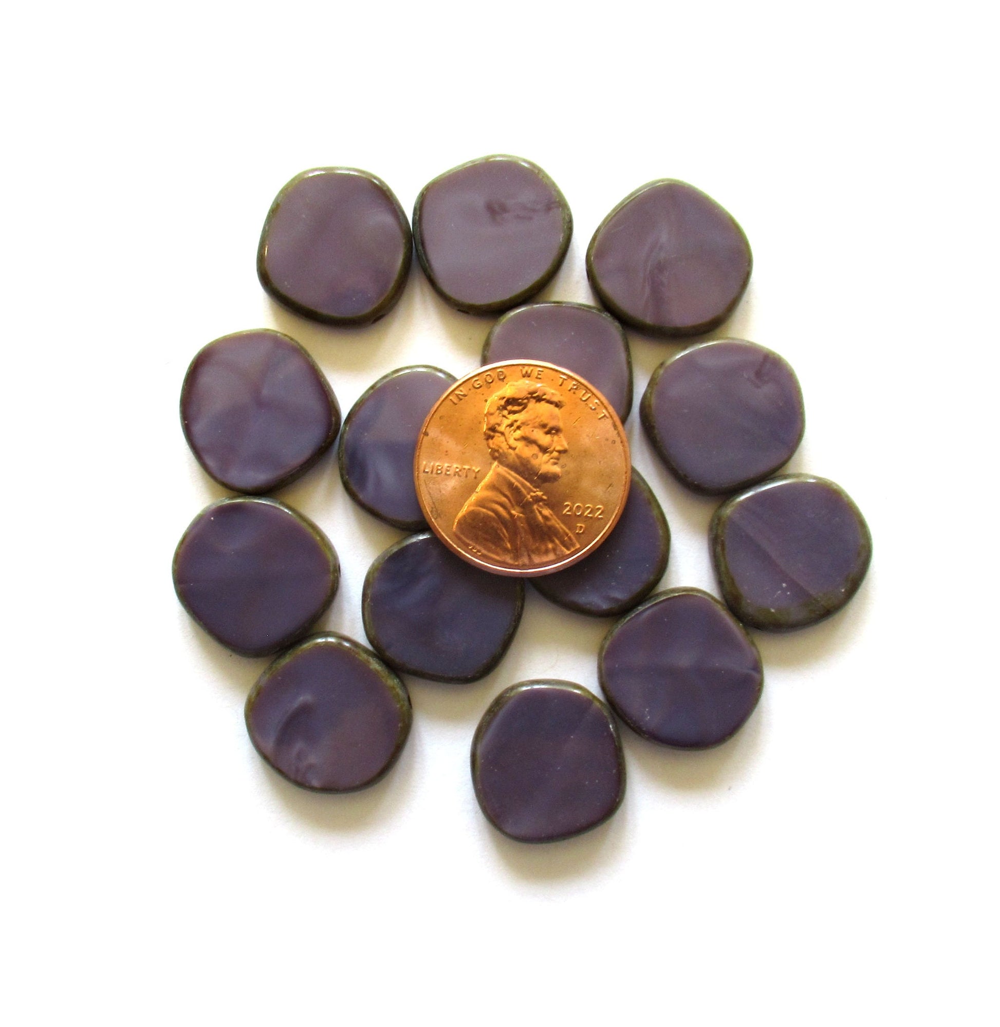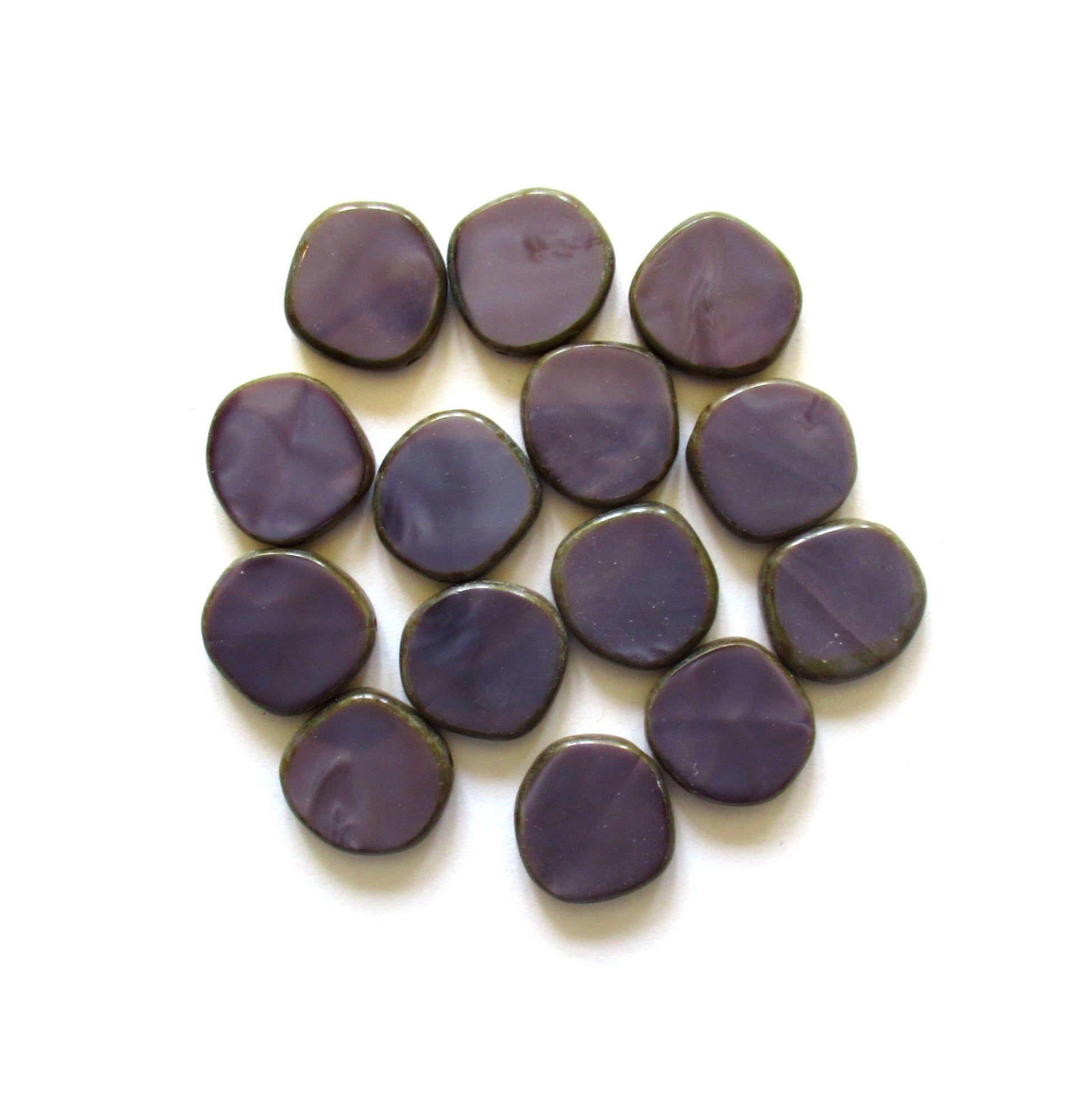 Six 15mm Czech glass asymmetrical coin or disc beads - opaque amethyst / purple silk picasso table cut beads - C00531