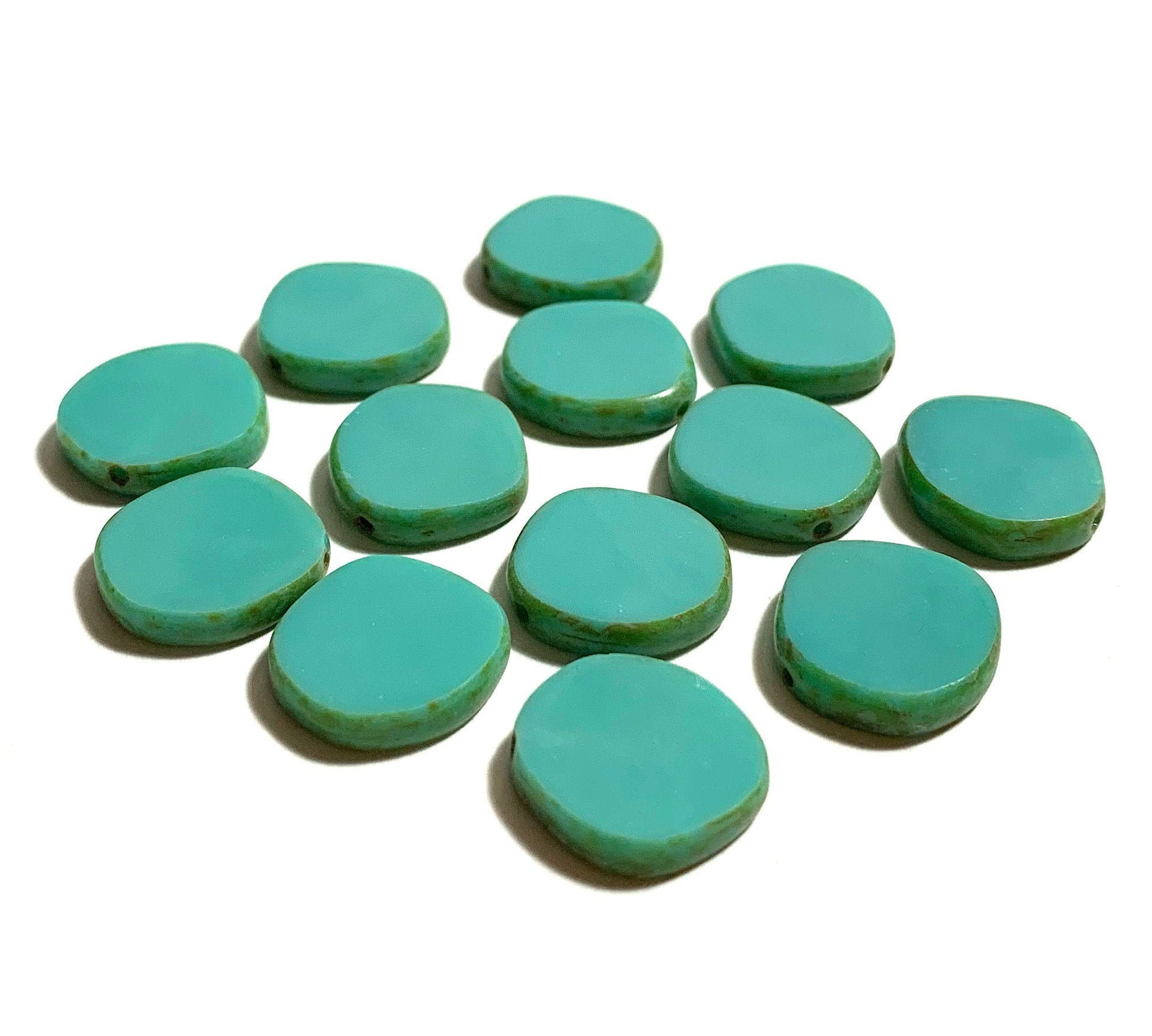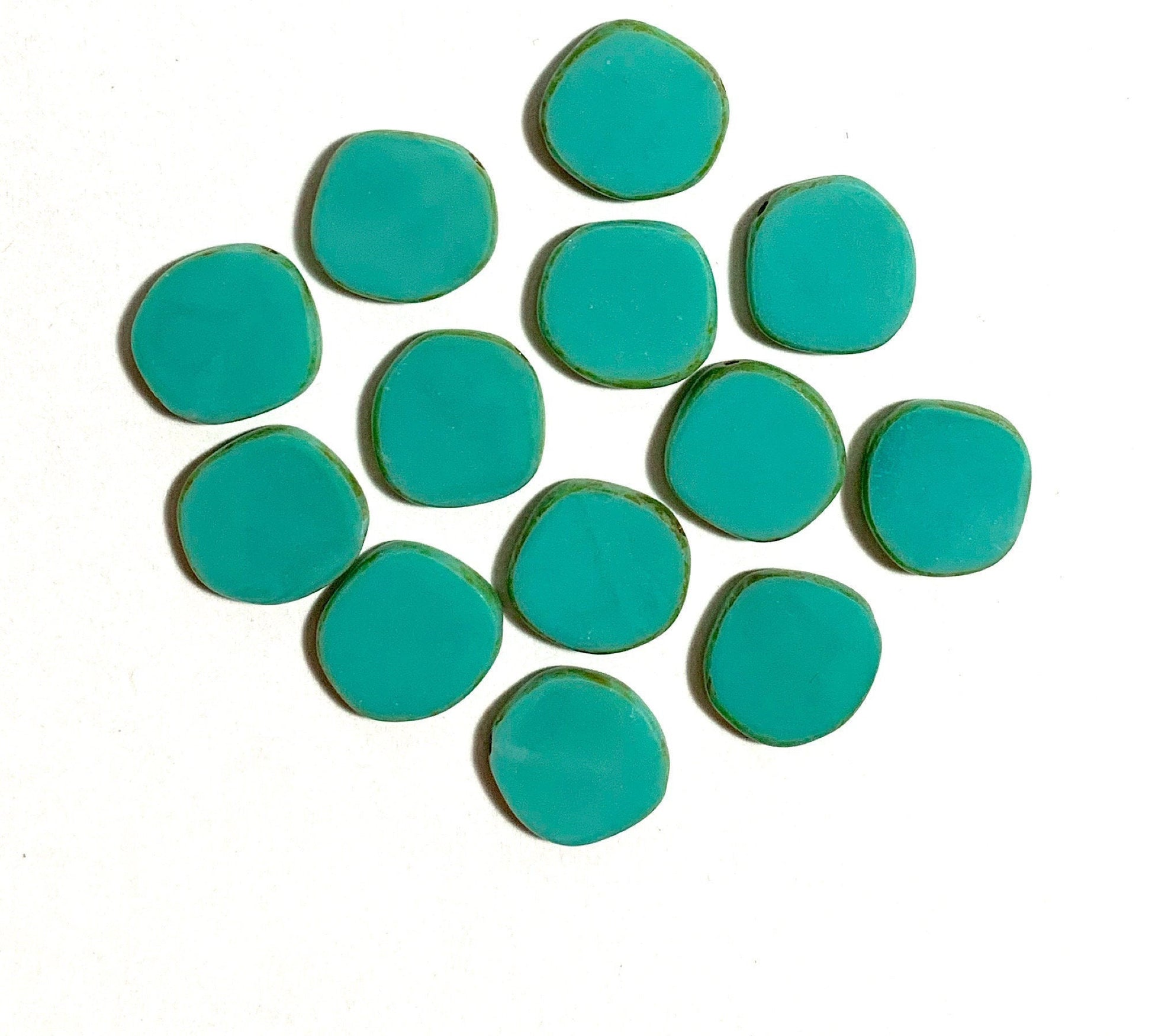 Six 15mm Czech glass asymmetrical coin or disc beads - opaque turquoise blue green Picasso table cut rustic earthy beads - C0041