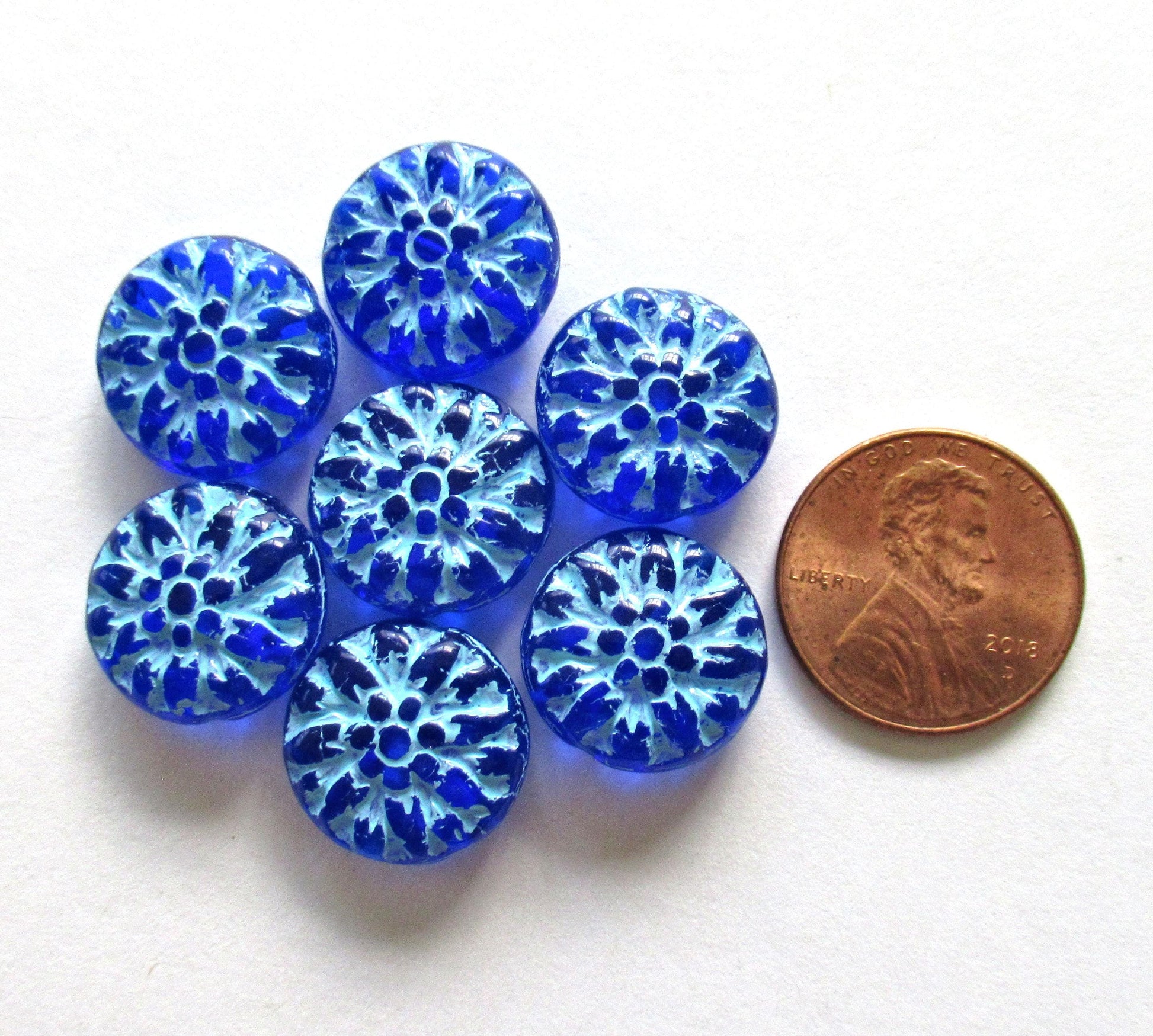 Six Czech glass Dahlia flower beads - Transparent cobalt blue w/ turquoise wash - 14mm floral puffy disc or coin beads C0009