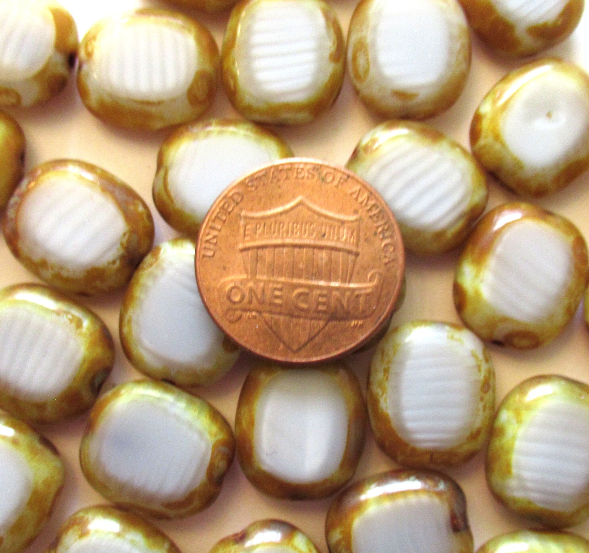 They are opaque marbled white beads with a bit of a gray tint and a brown picasso finish along the edges.