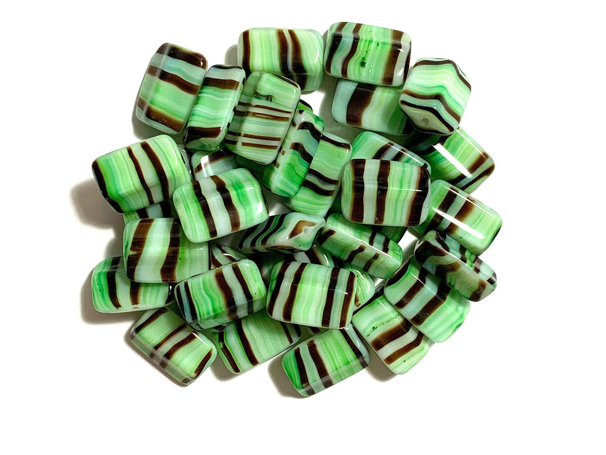 Six Czech glass rectangle beads - 16 x 12mm green, brown, and white striped - 4-sided diamond shaped large, chunky rectangle beads C0005