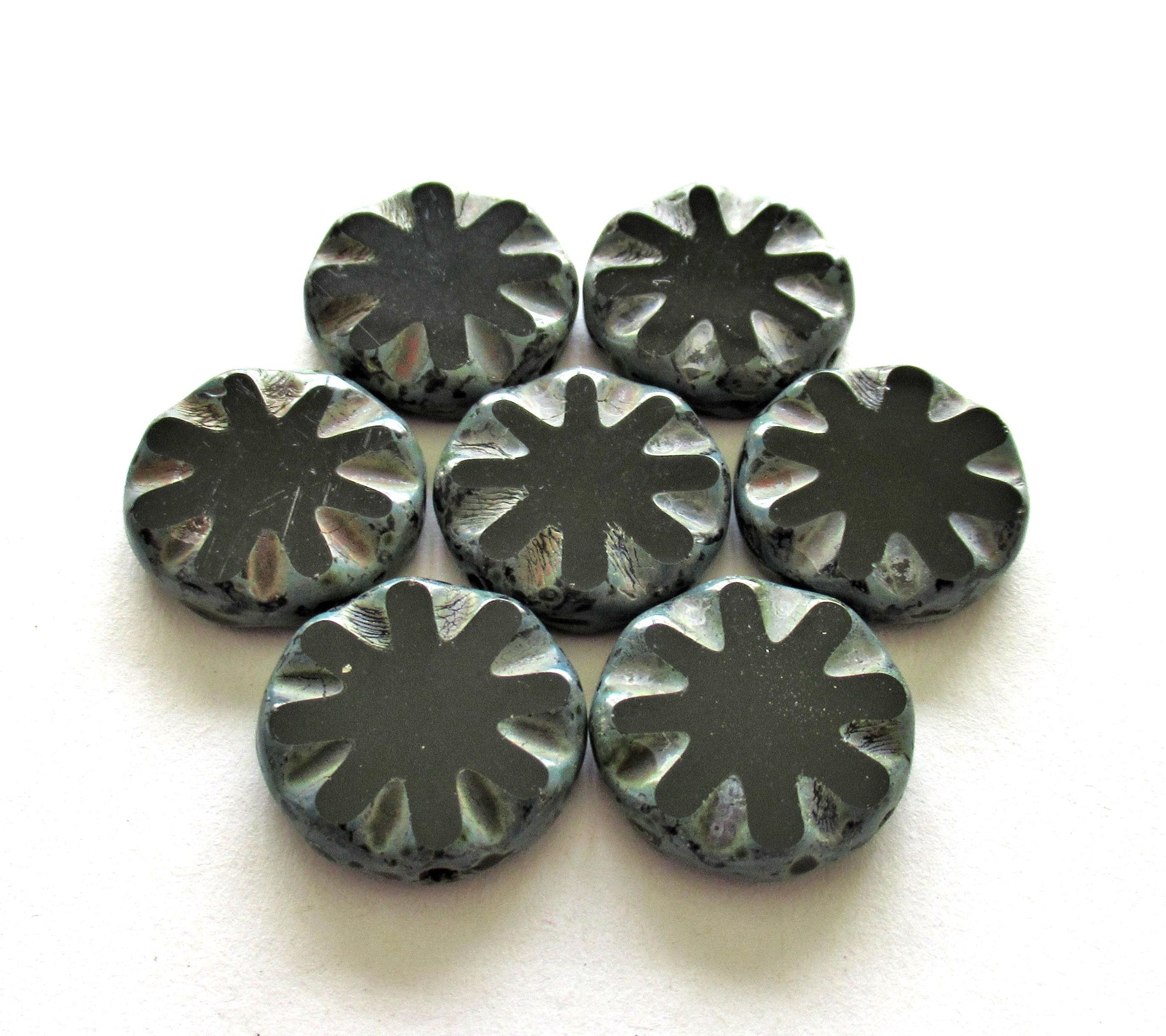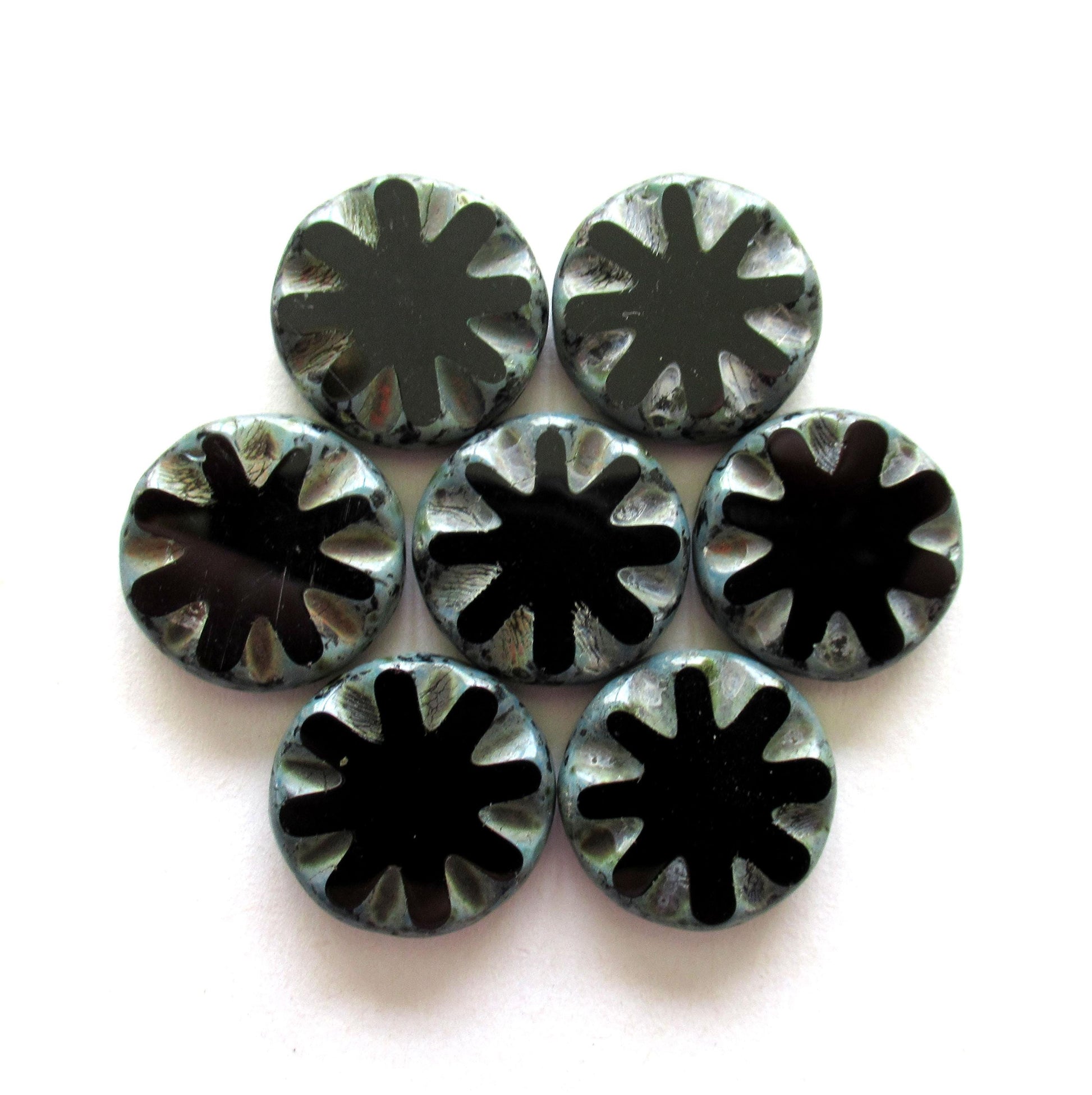 Six large Czech glass coin or disc beads - jet black picasso - 18mm - table cut beads with a spider flower or sun pattern - C00161