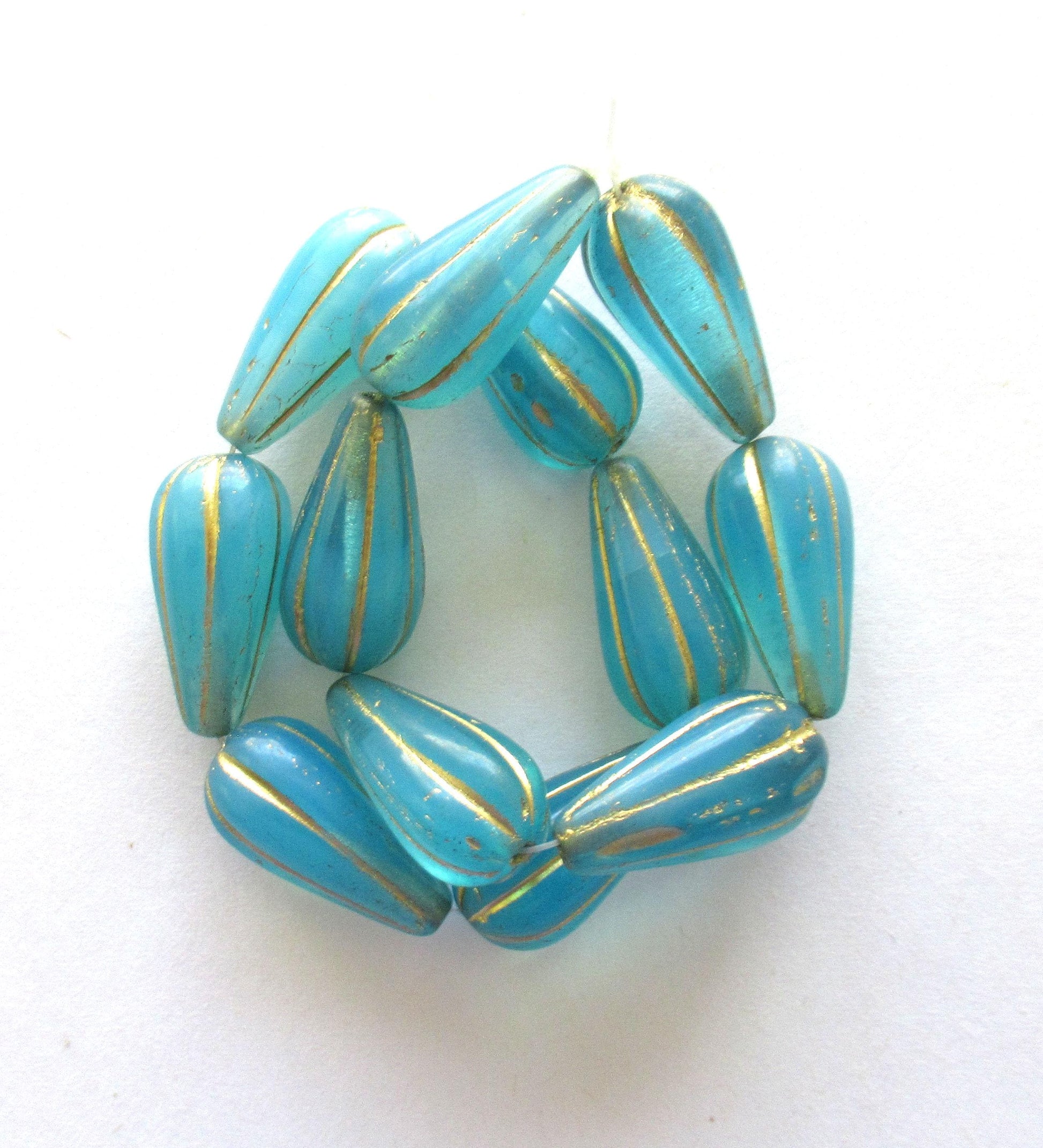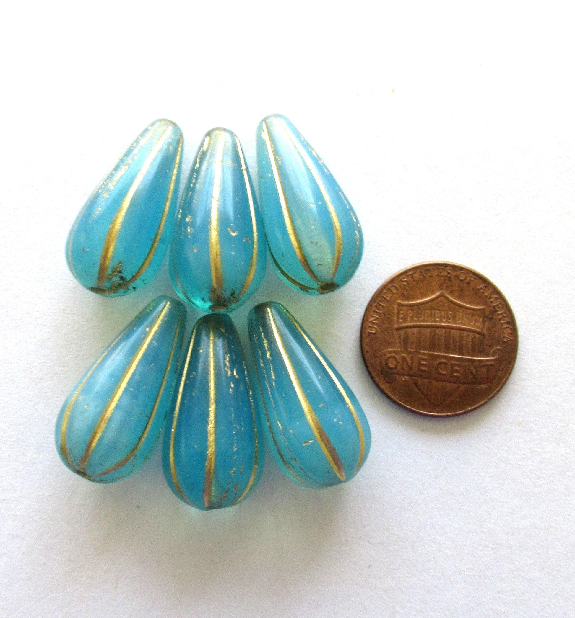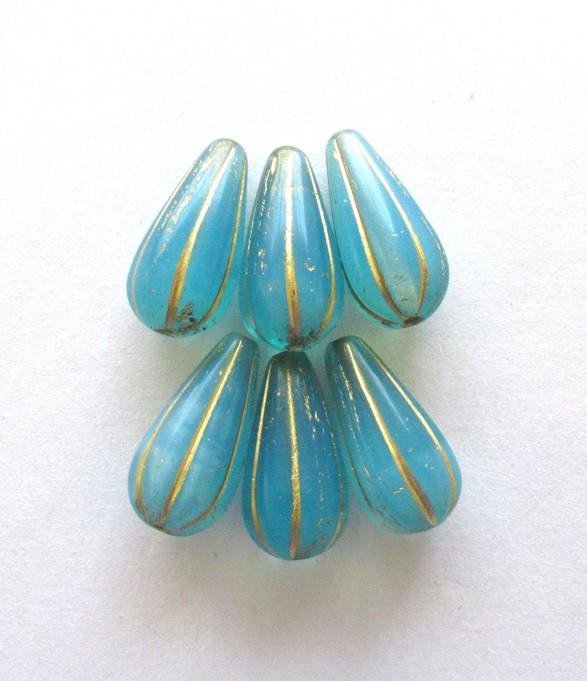 Six large Czech glass teardrop melon beads - blue opal w/ gold accents - 22 x 11mm tear drop beads 00571