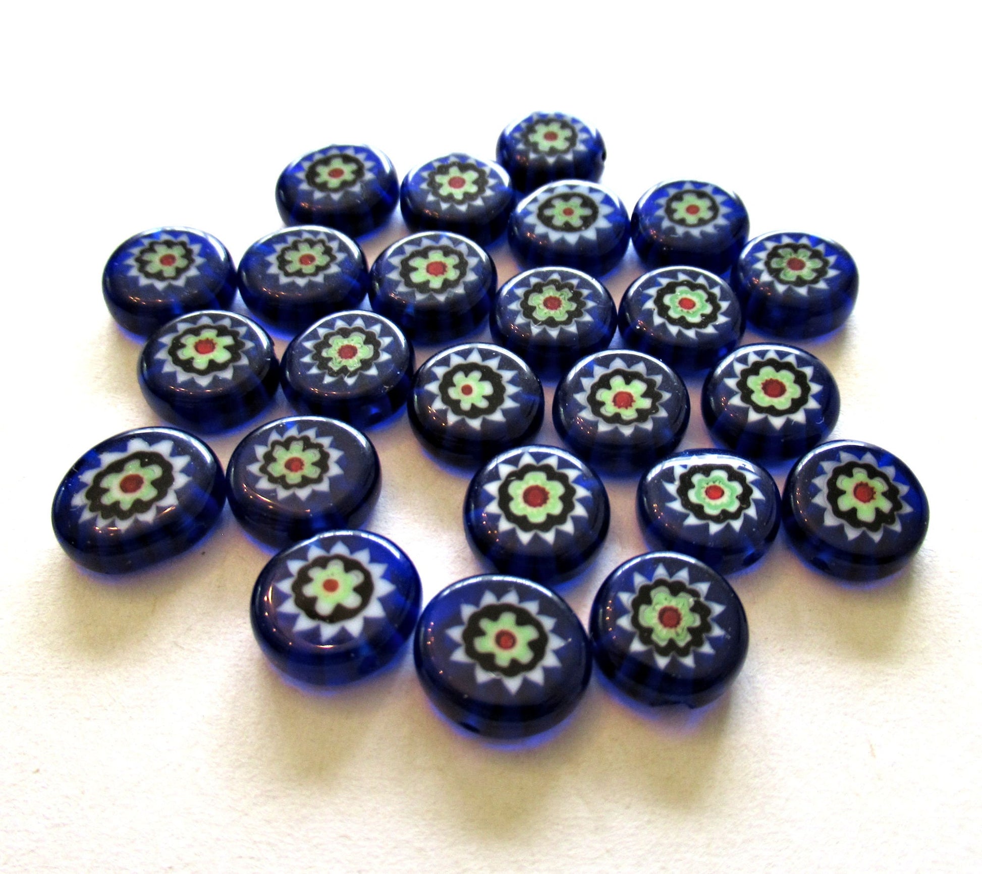 Ten 10mm cane or millefiori glass beads - cobal blue, green and red coin or disc beads - C0095