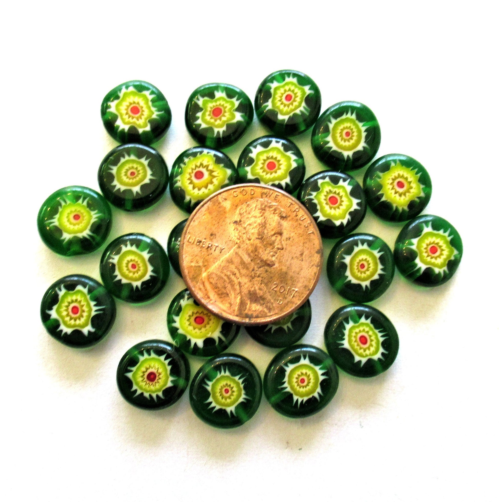 Ten 10mm cane or millefiori glass beads - green yellow and red color mix coin or disc beads - C0006