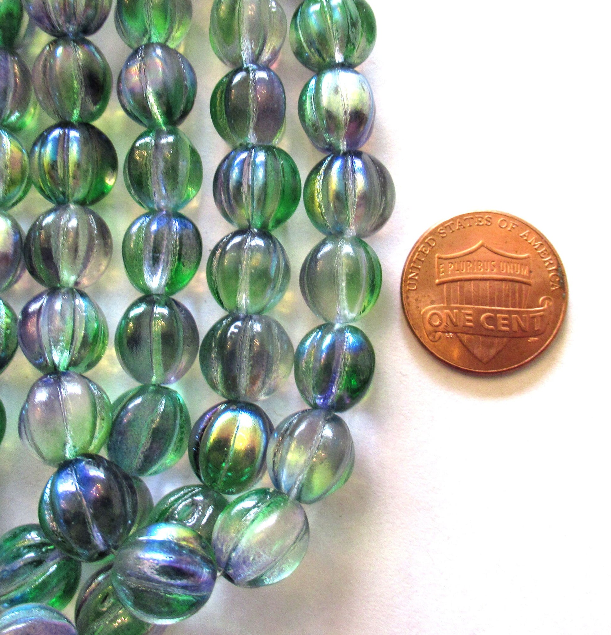 Ten 10mm Czech glass melon beads - green & purple mix pressed glass beads - C0049