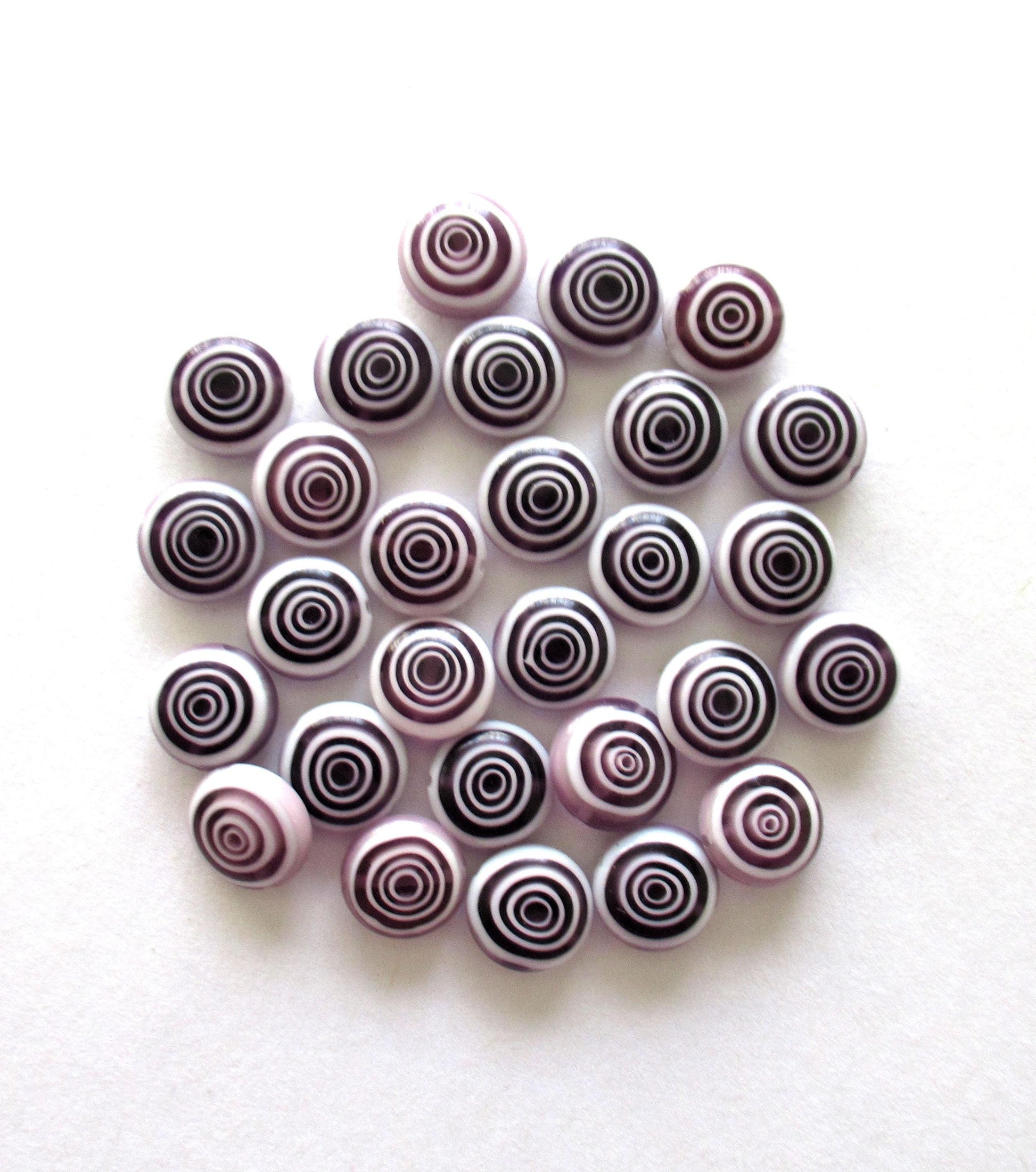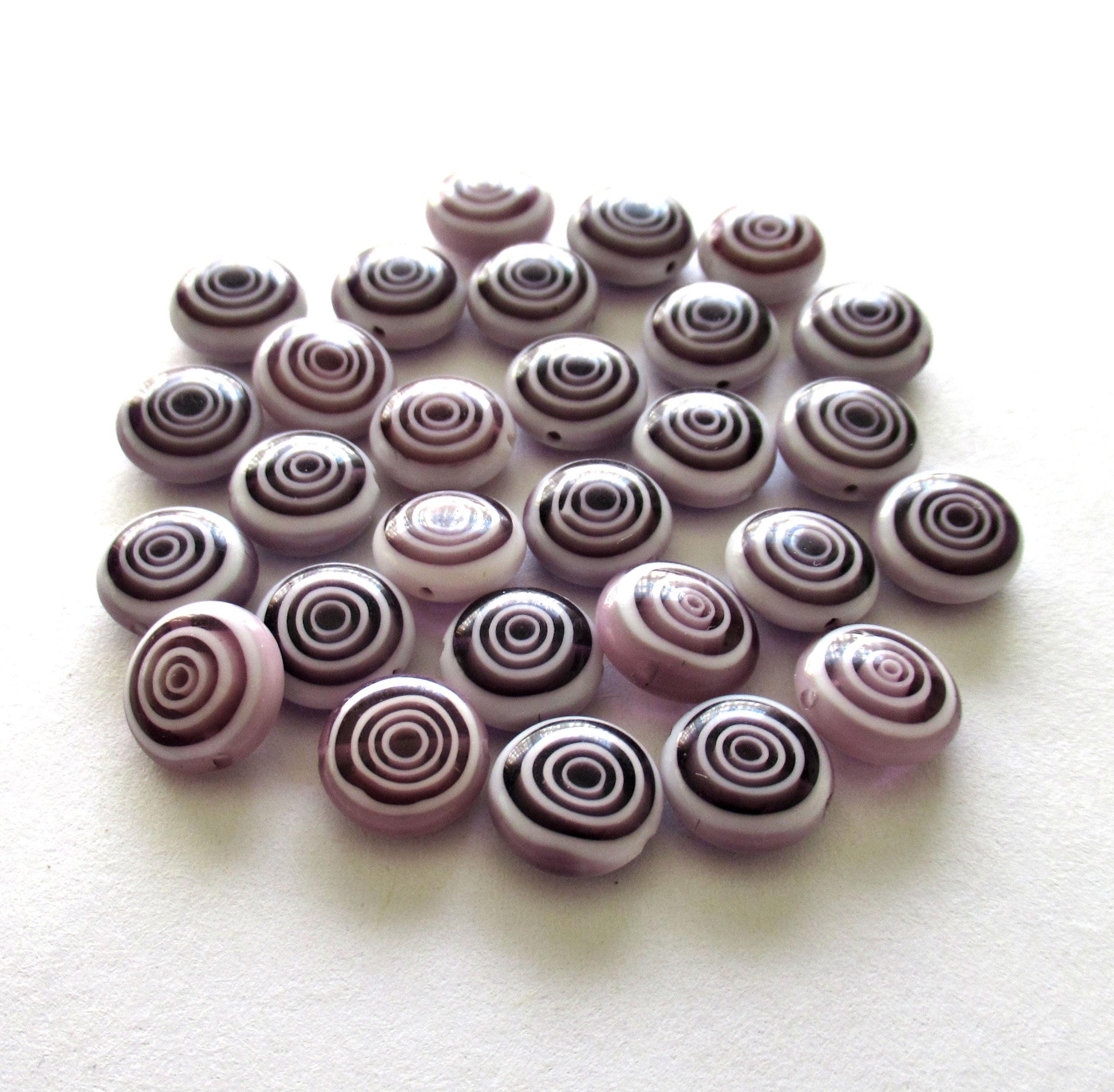 Ten 10mm glass coin beads - amethyst / purple and white disc beads - target or concentric circles beads - C0001