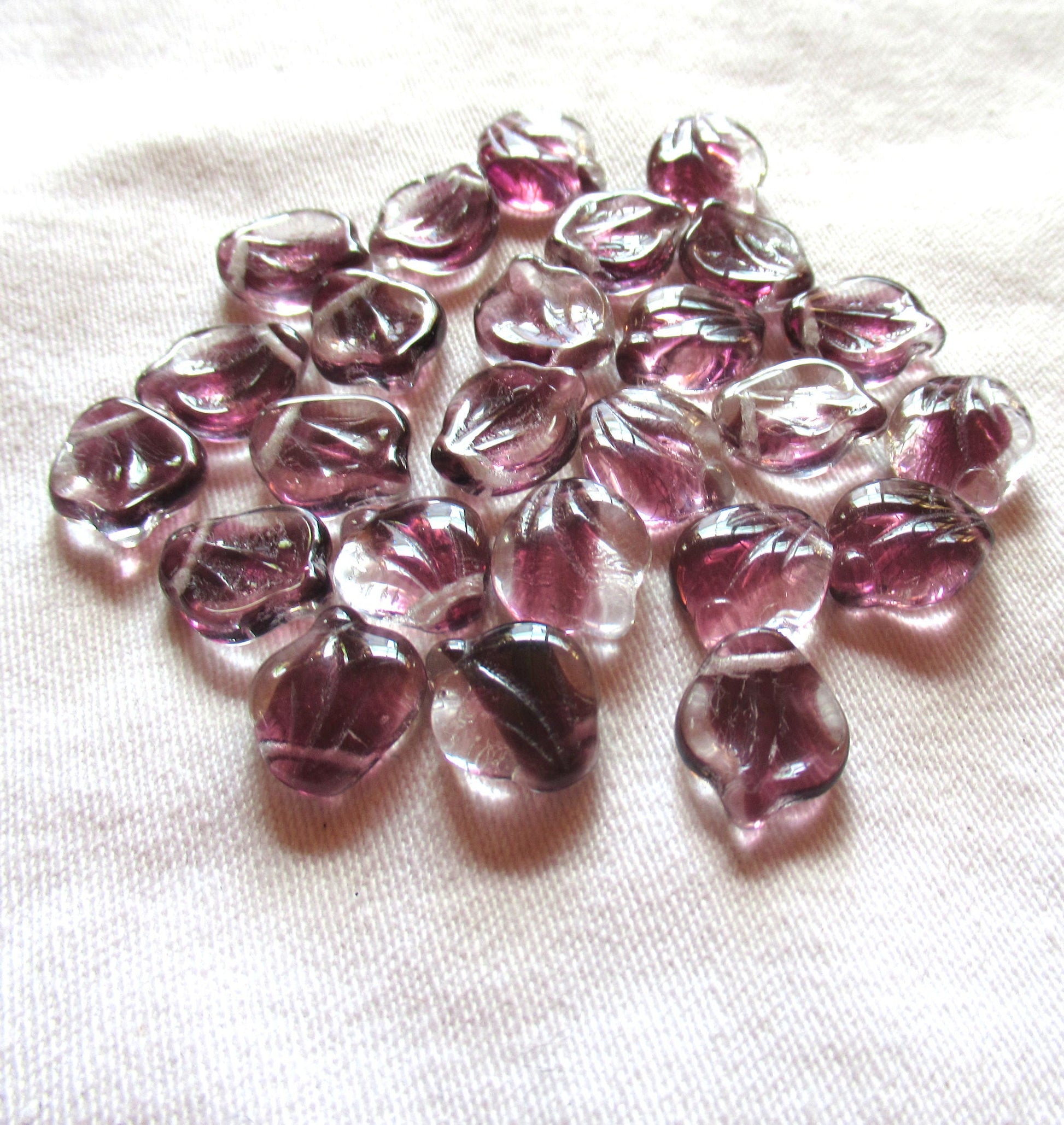 Ten 12 x 15m large Czech glass leaf beads, - crystal clear with streaks of purple or amethyst side drilled beads