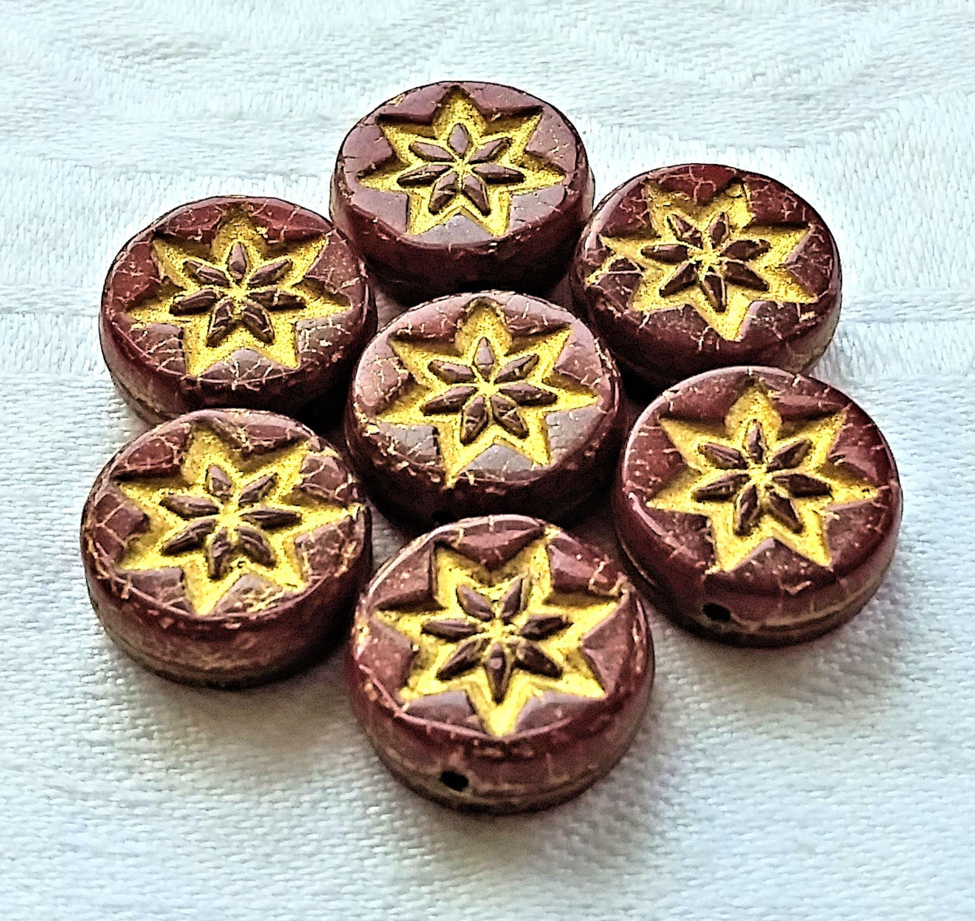 Ten 13mm coin or disc flower beads - translucent red opal with a gold wash - Czech glass star beads - 4.5mm thick C08201