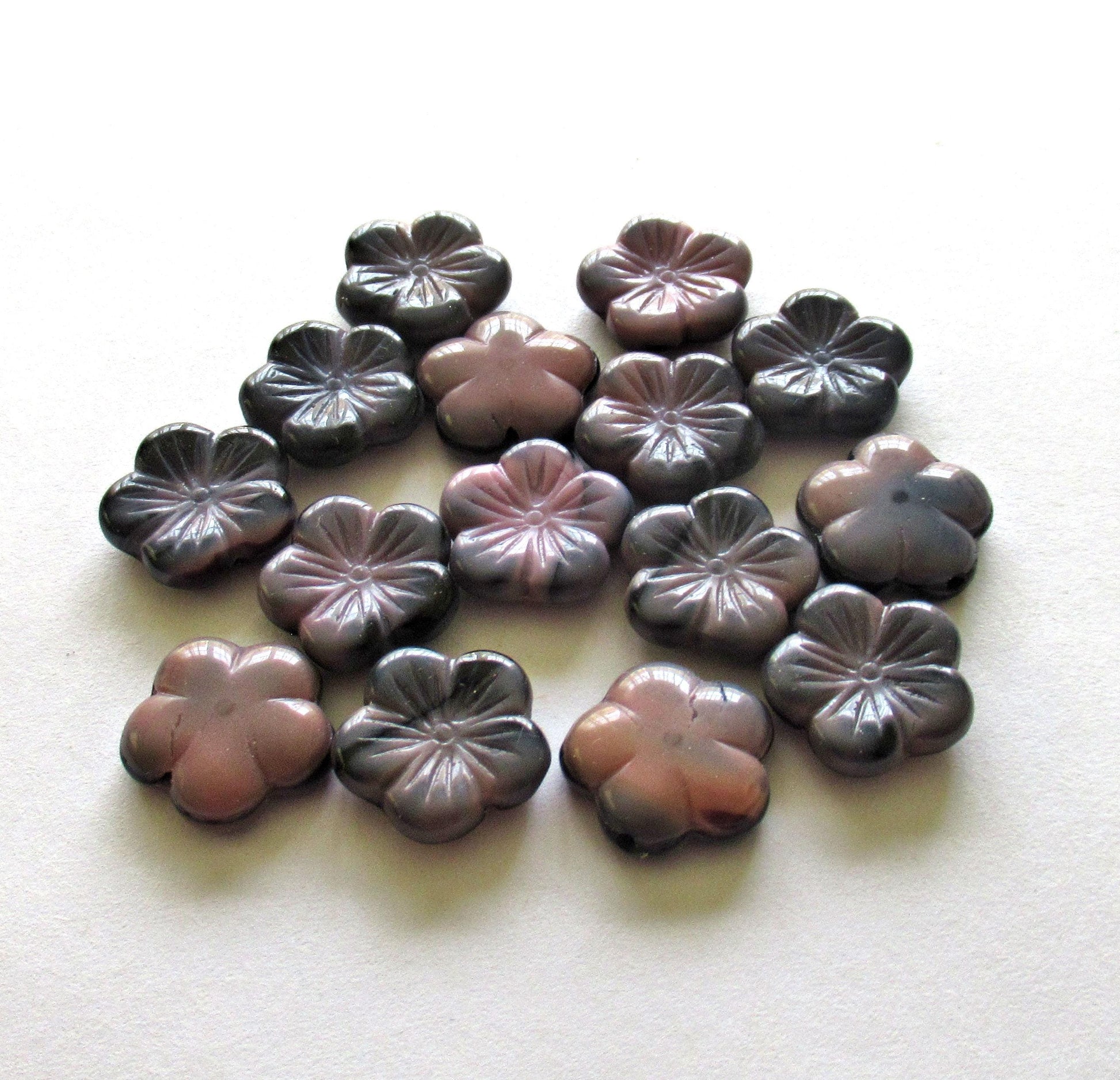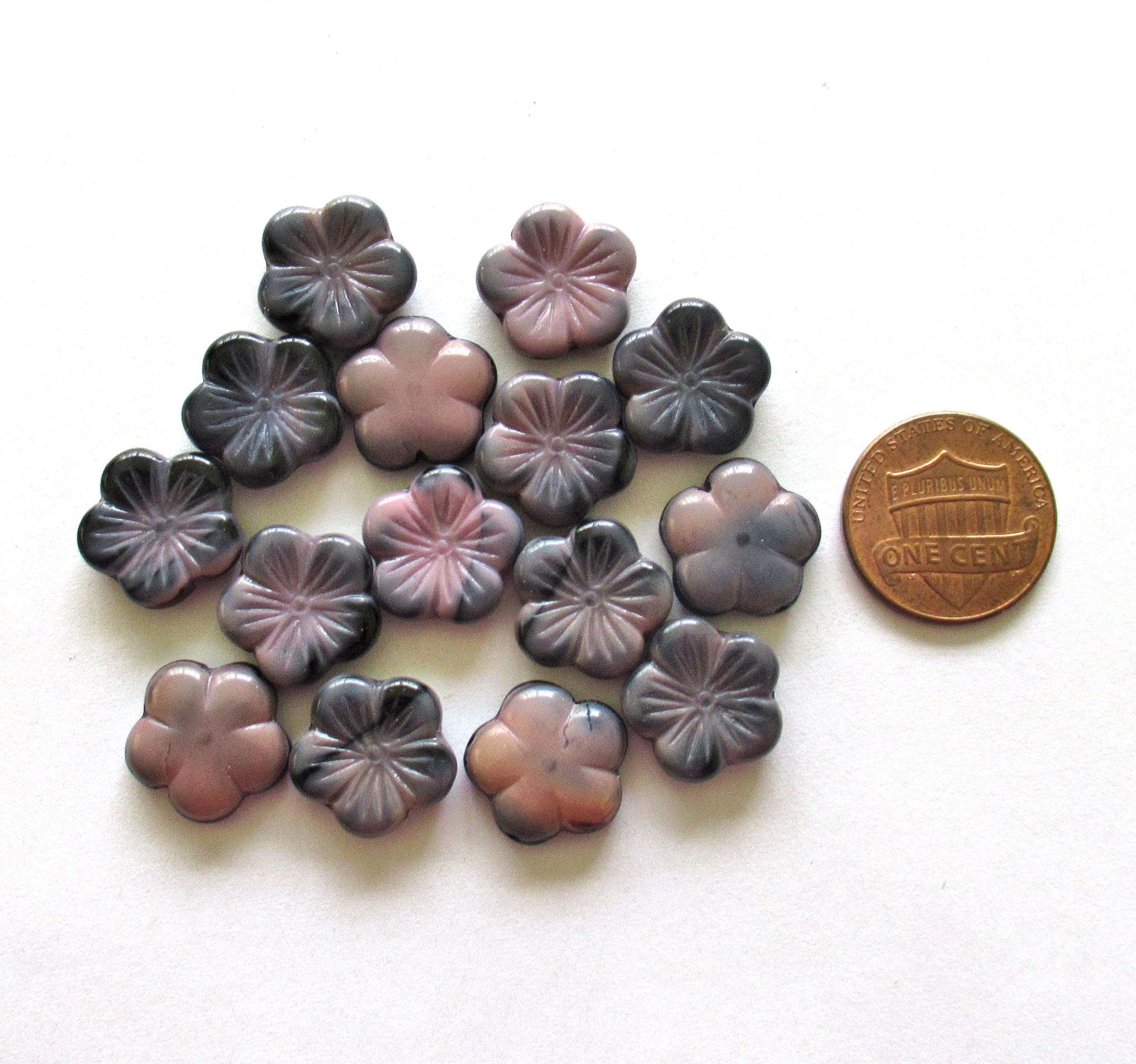 Ten 14mm Czech glass flower beads - marbled pink & black mix - pressed glass floral beads - C0441