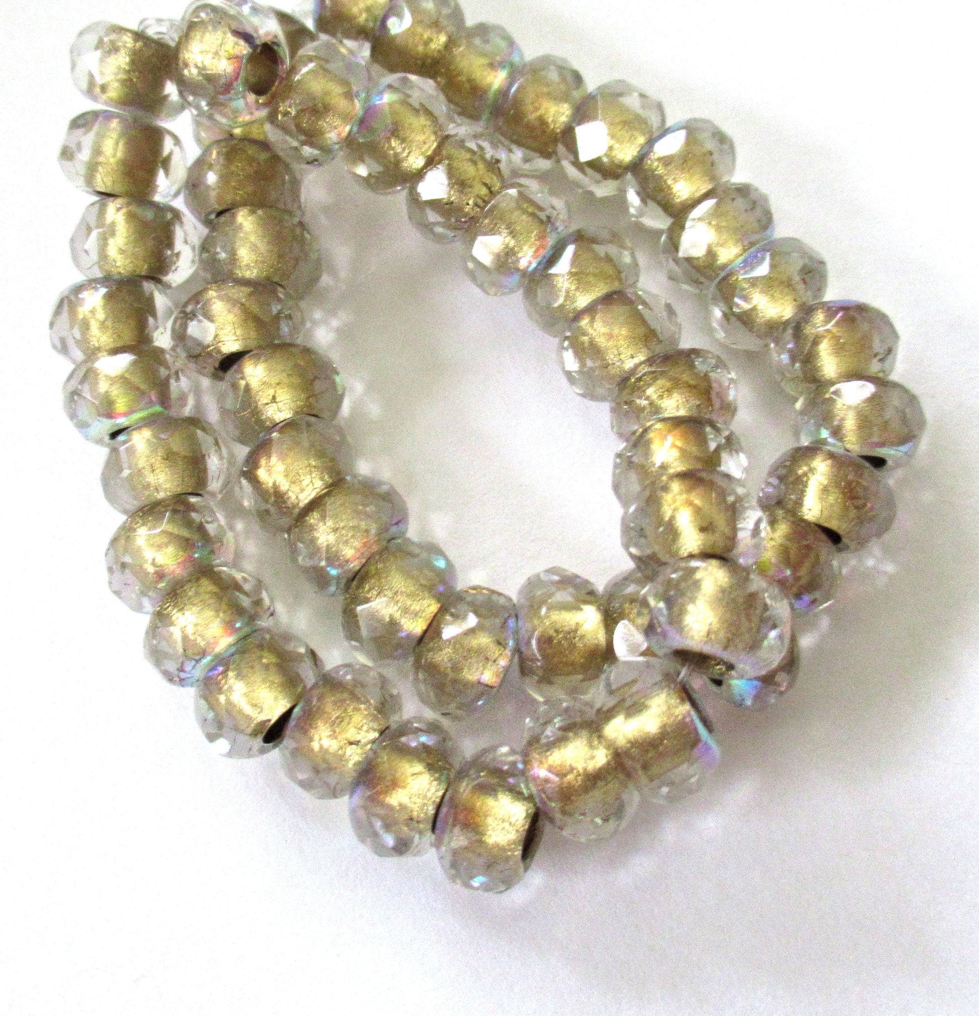 Ten Czech glass faceted roller beads - 9 x 6mm - crystal clear ab gold lined beads - tyre beads - big 3mm big hole beads C00011