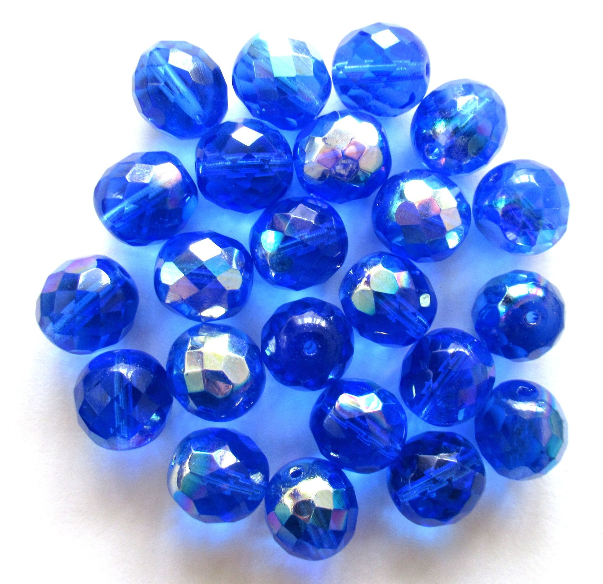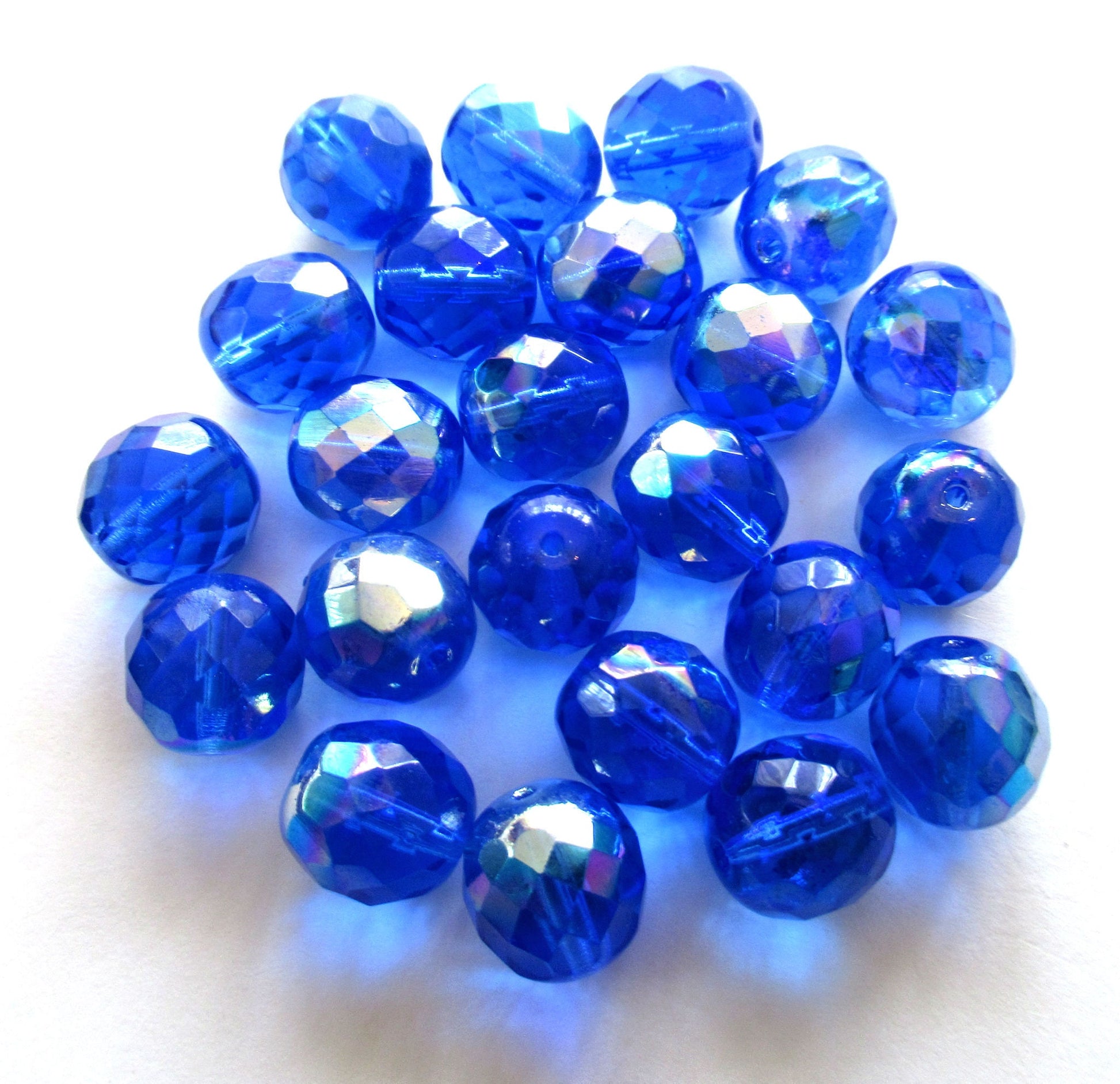Ten Czech glass fire polished faceted round beads - 12mm sapphire blue beads with an AB finish C0089