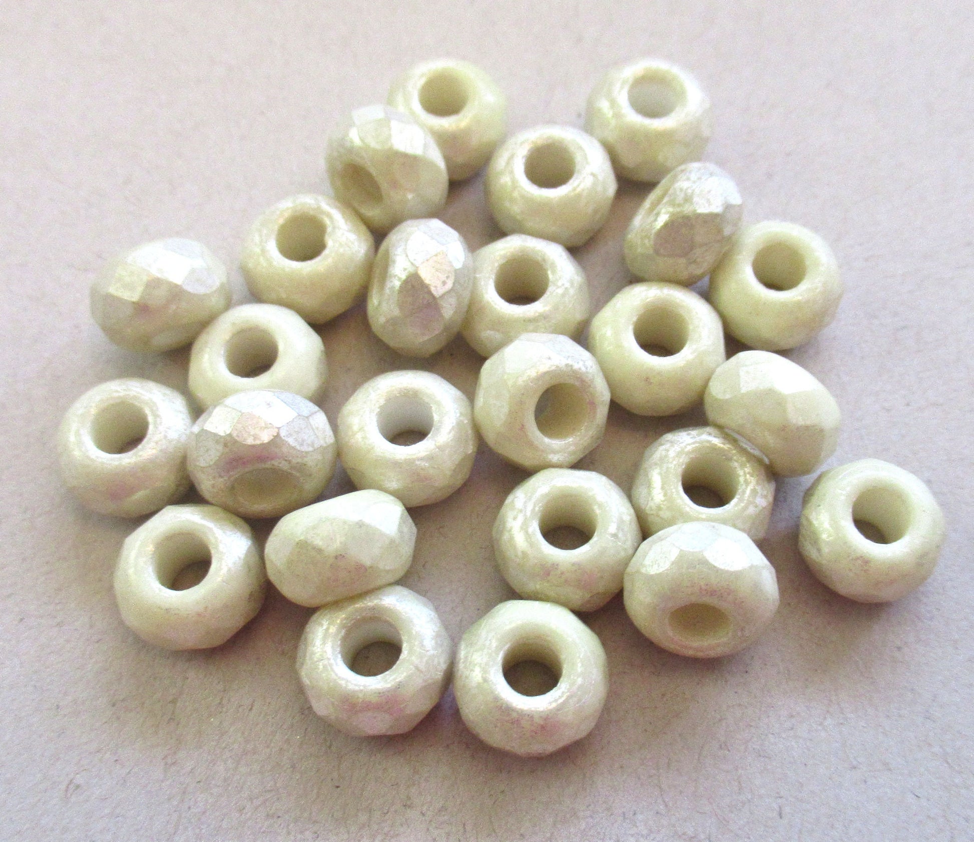 Ten Czech glass roller beads - 6 x 9mm off white or ecru w/ a silvery mercury finish faceted roller, rondelle, big 3.5mm hole beads C0099