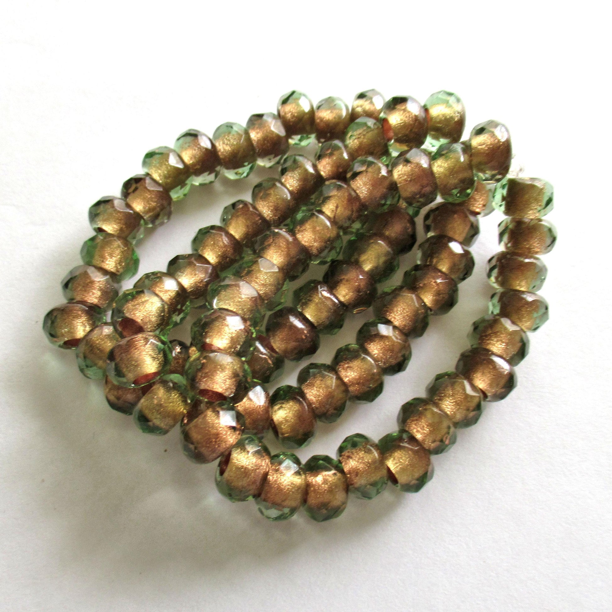 Ten Czech glass roller beads - 9 x 6mm - light green copper lined - faceted - big 3.5mm hole roller - rondelle - donut beads C00911