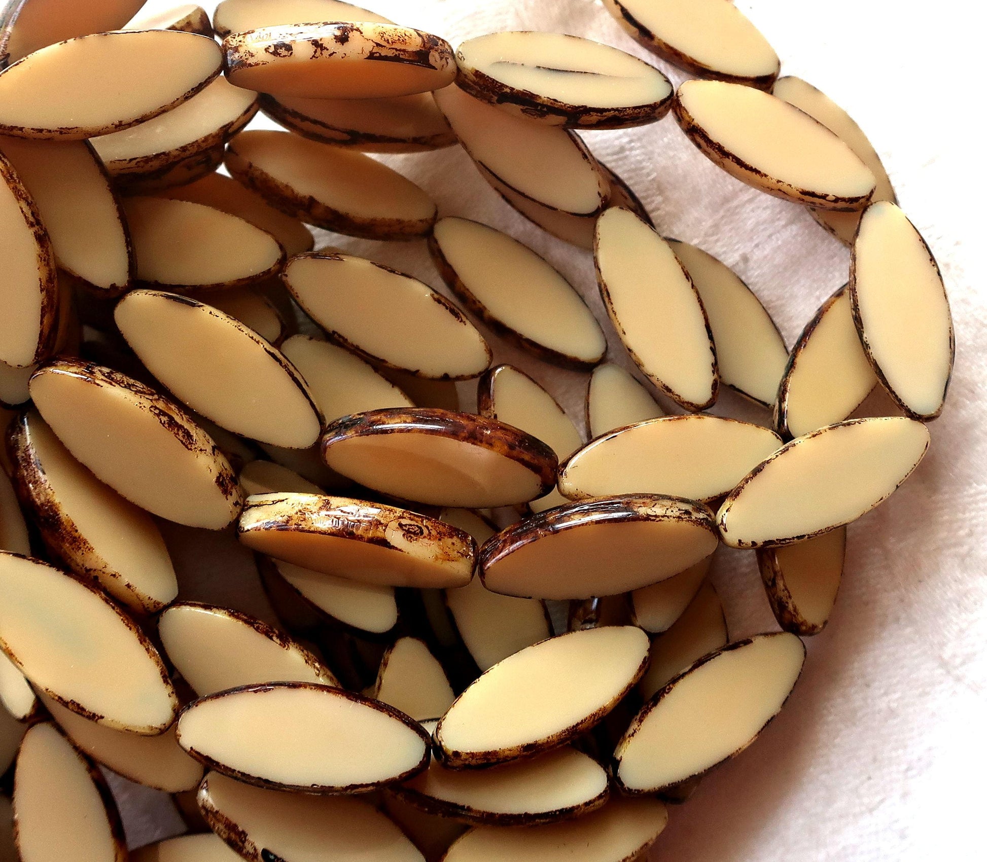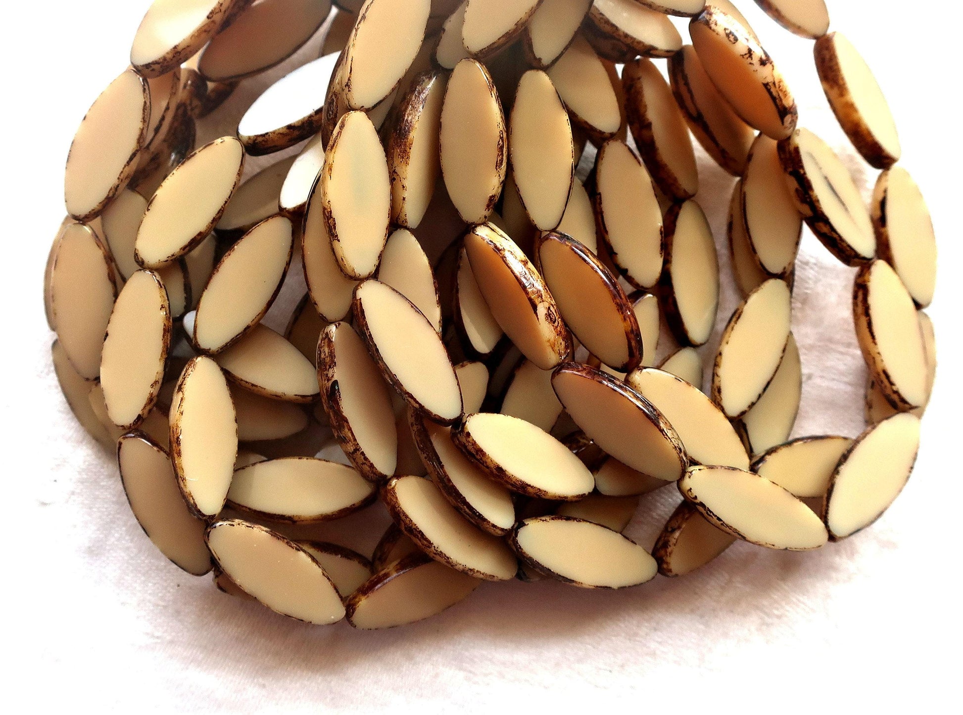 Ten Czech glass spindle beads, 20 x 9mm, neutral opaque beige, off white picasso, table cut, almond or tube shaped beads C76101