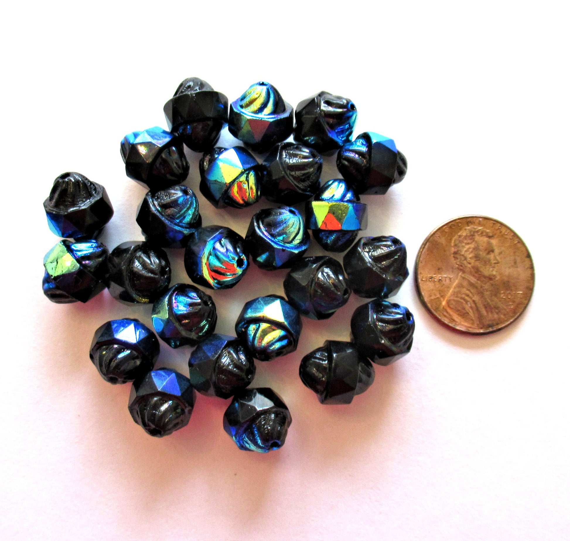 Ten Czech glass turbine beads - 11 x 10mm opaque jet black ab - faceted, fire polished saturn beads - C0008