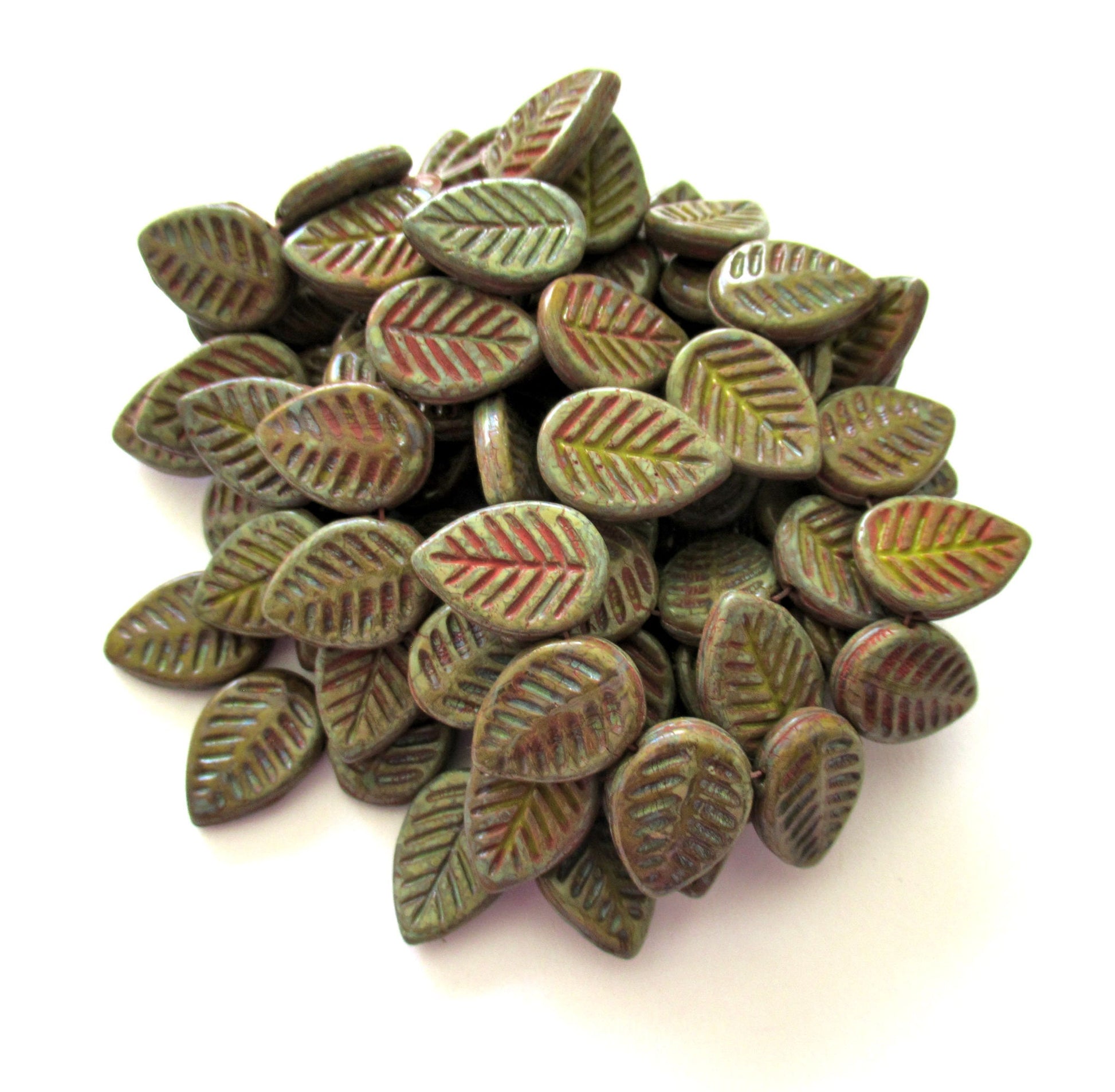Ten large Czech glass leaf beads - side drilled artichoke green beads with a coral wash- 12 x 16mm carved beads C00831