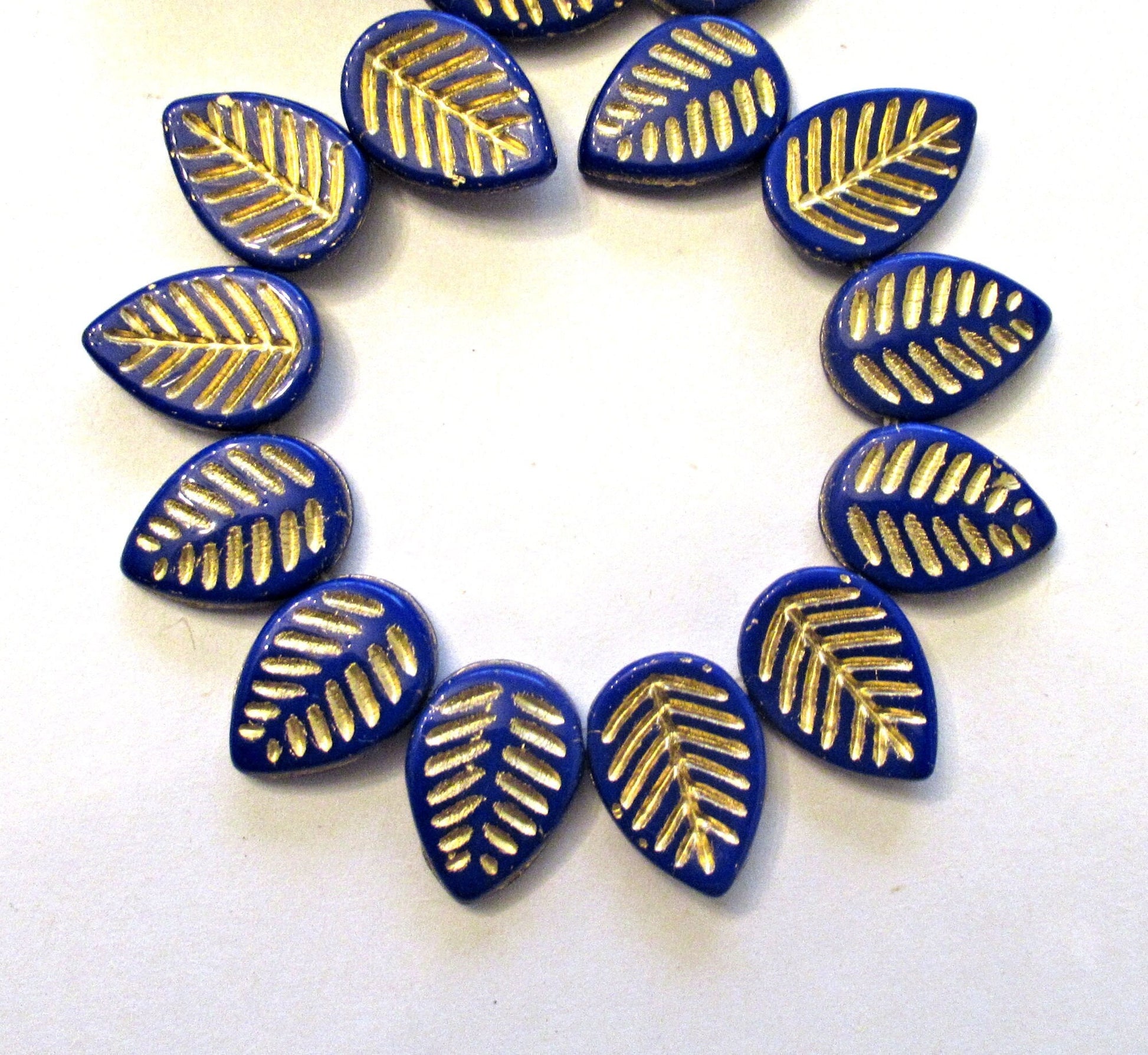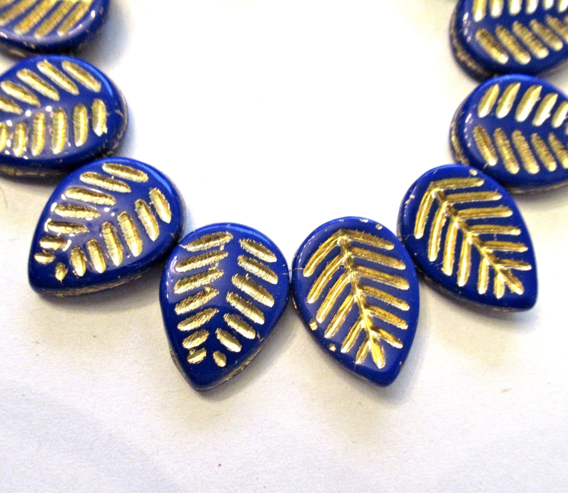 Ten large Czech glass leaf beads - side drilled - opaque royal blue beads with a gold wash - 12 x 16mm carved beads C00041
