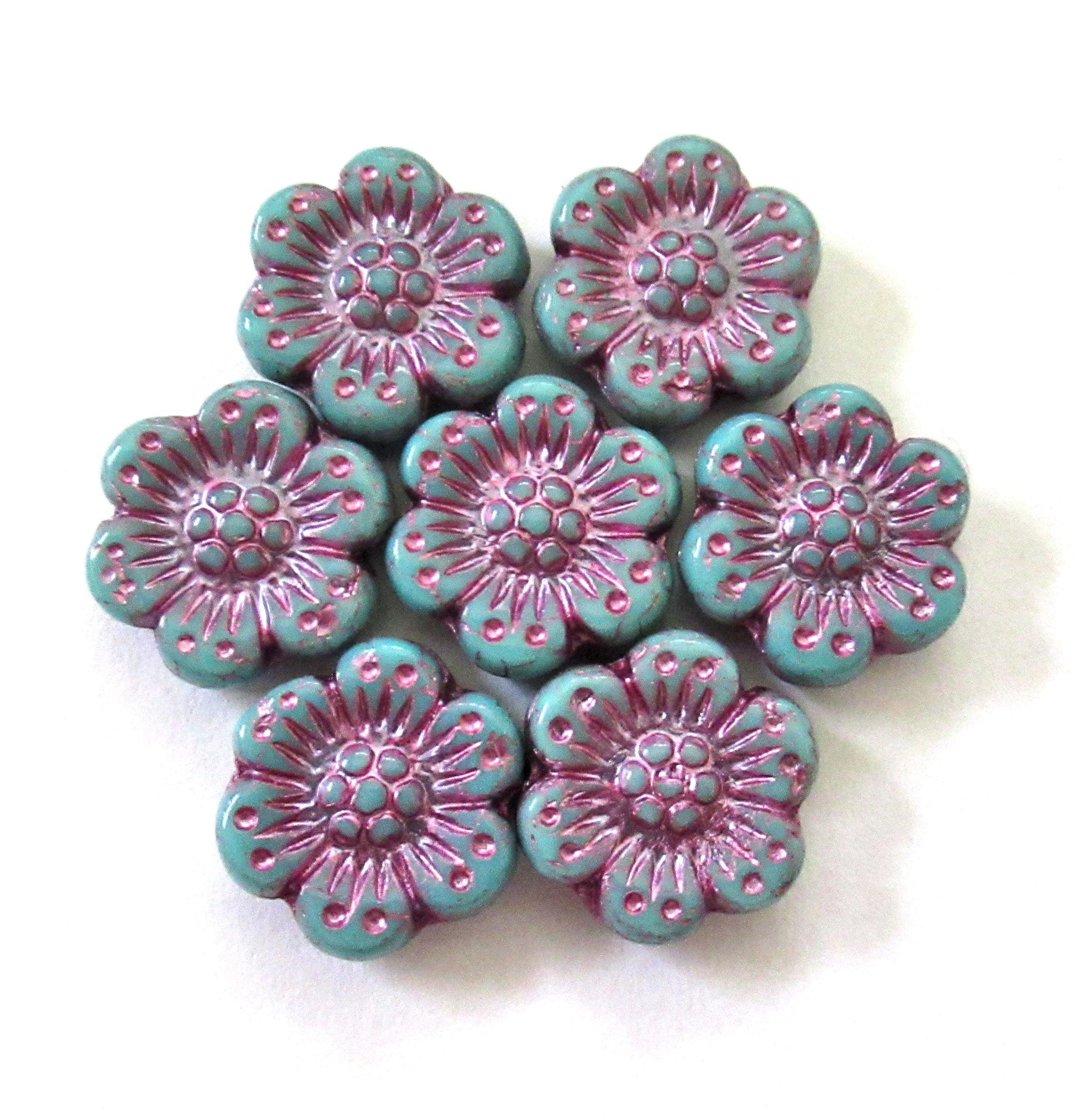 Twelve Czech glass wild rose flower beads - 14mm opaque turquoise blue floral beads with a pink wash - C00022