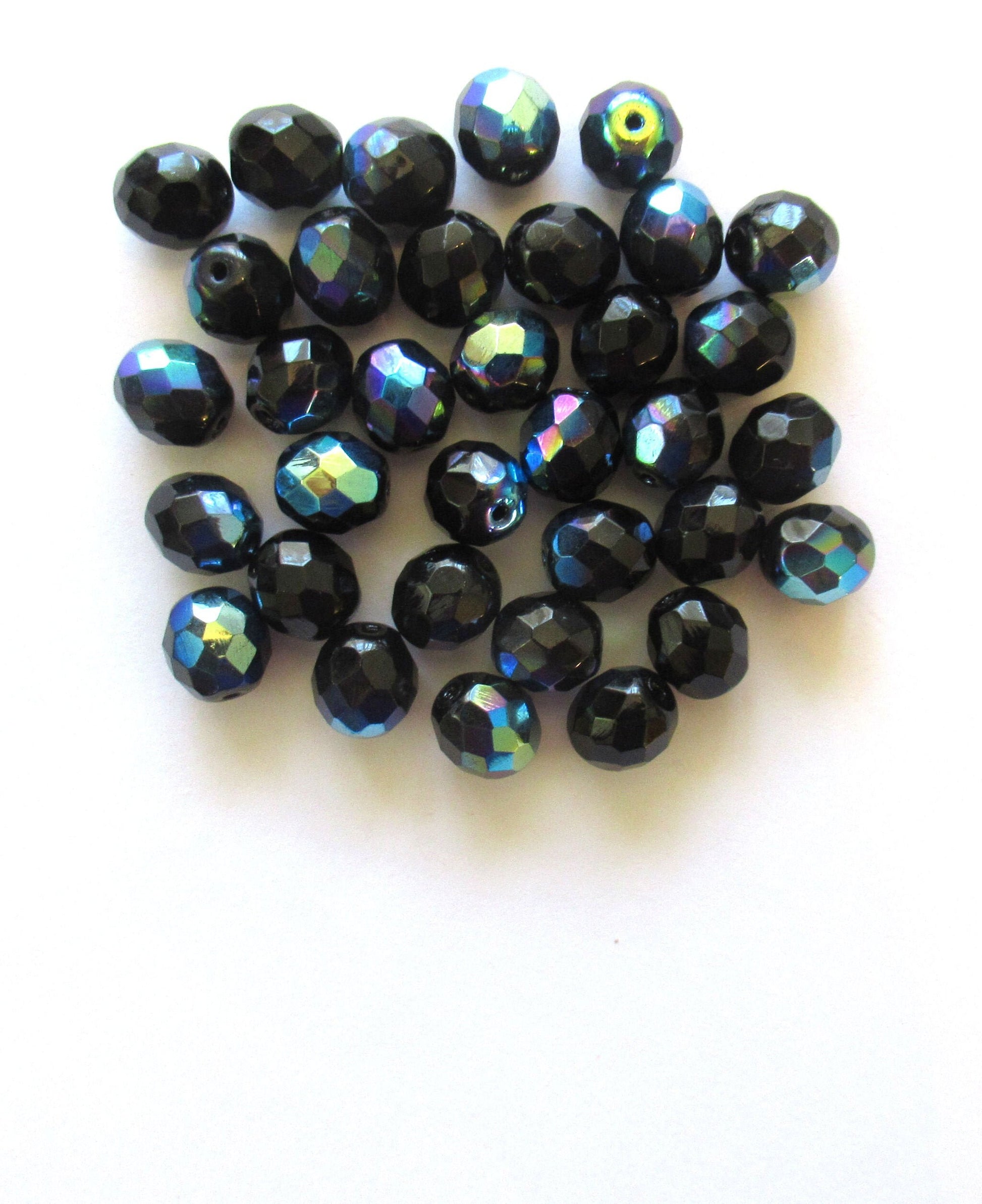 Twenty Czech glass fire polished faceted round beads - 10mm jet black AB beads C0087