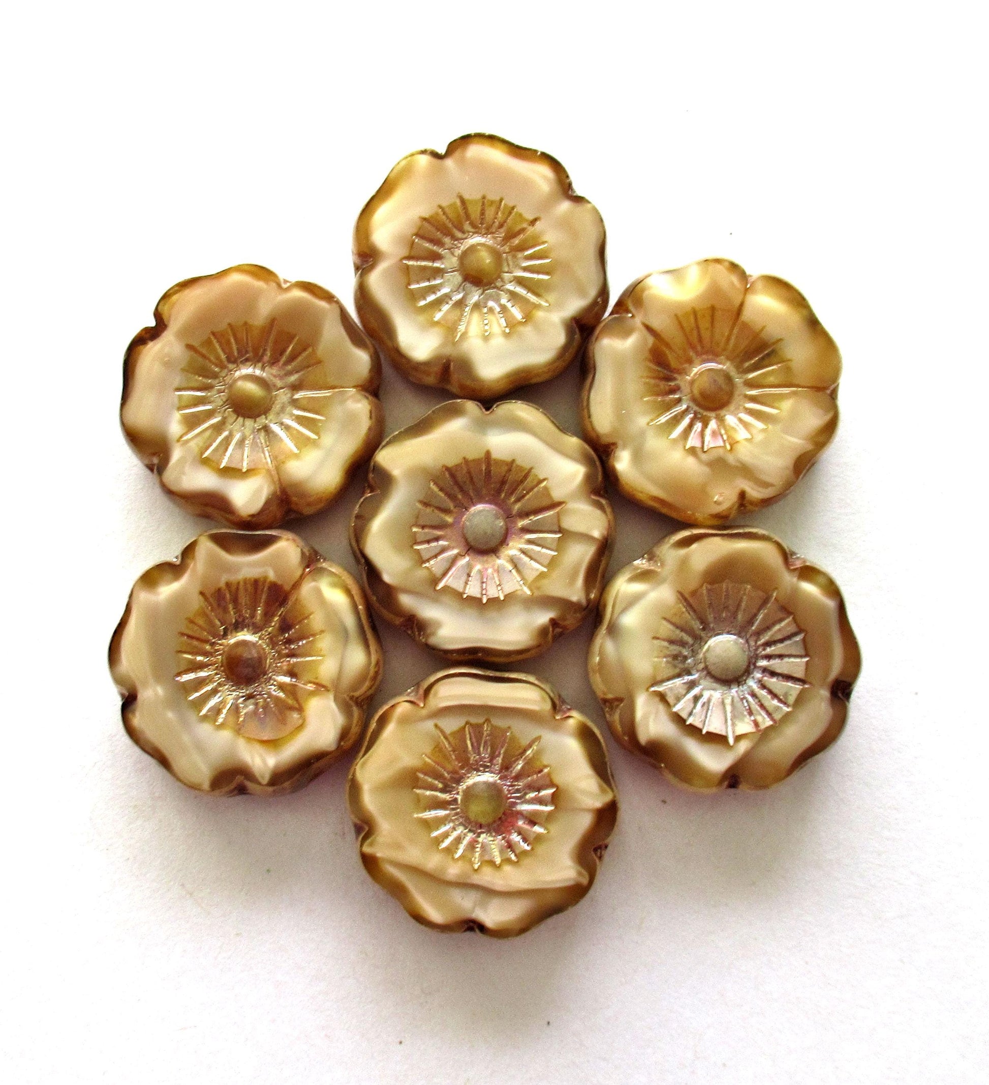 Two large 22mm Czech glass flower beads - Table cut carved silky marbled beige picasso beads - Hawaiian hibiscus focal flower beads - 00881